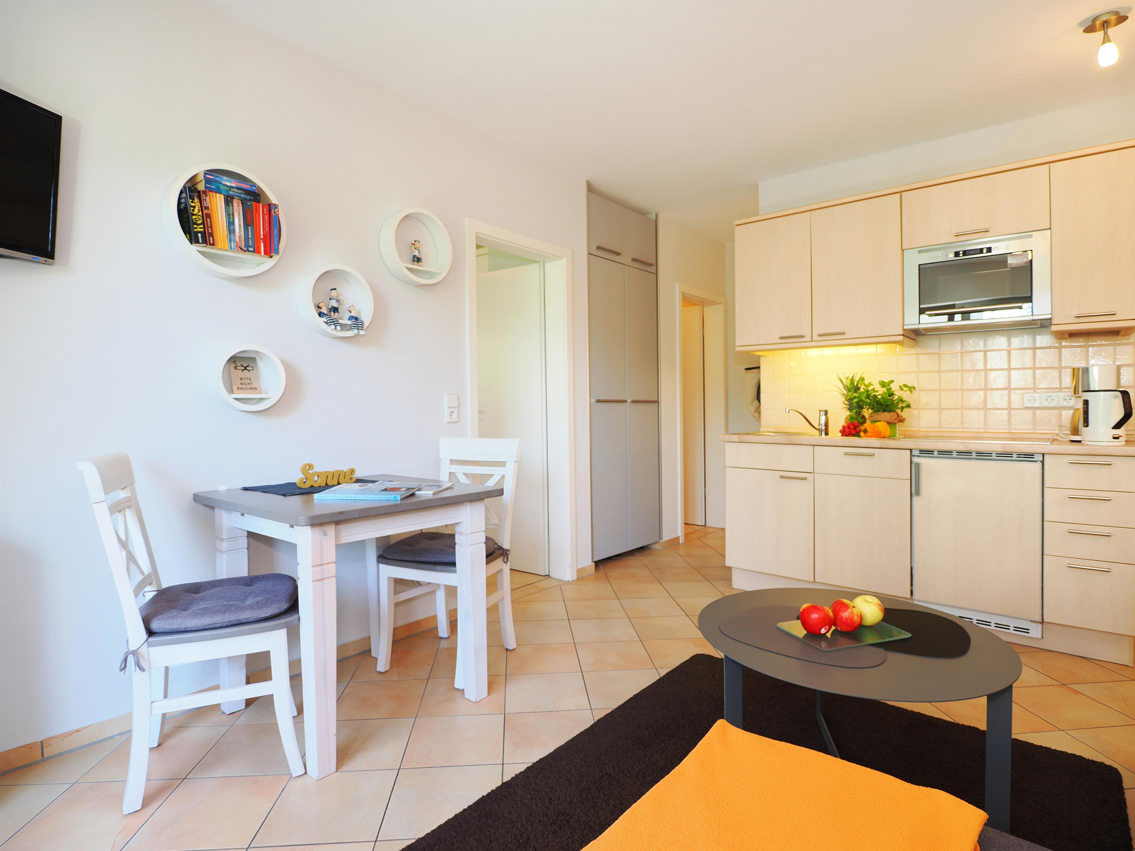 Dieses 37 qm große 2 Zimmer Appartement befindet sich im Hochparterre und ist für 2 Personen und max. ein Kind geeignet. Der geschmackvoll eingerichtete Wohnraum ist mit seiner breiten Fensterfront vom Licht verwöhnt und bietet den Gästen eine gemütliche Eckcouch mit Schlaffunktion (Liegefläche 140 x 185) zum Entspannen. Flat-TV und Radio sind selbstverständlich. Der Essplatz sowie die Küchenzeile incl. Geschirrspüler, Kühlschrank, Mikrowelle, Cerankochfeld etc. befinden sich ebenfalls im Wohnraum. Den Balkon in westlicher Ausrichtung können die Gäste vom Wohnraum begehen. Das Schlafzimmer ist mit einem Doppelbett mit getrennten Matratzen (80 x 200) und reichlich Schrankraum eingerichtet. Im modernen hochwertigen Bad steht den Gästen eine Dusche sowie Waschtisch/WC zur Verfügung. Im Keller finden Sie eine Sauna, einen Fahrradraum, Waschmaschine und Trockner. Der Pkw-Stellplatz befindet sich auf dem abgeschlossenen Grundstück und ist der Wohnung zugeordnet.