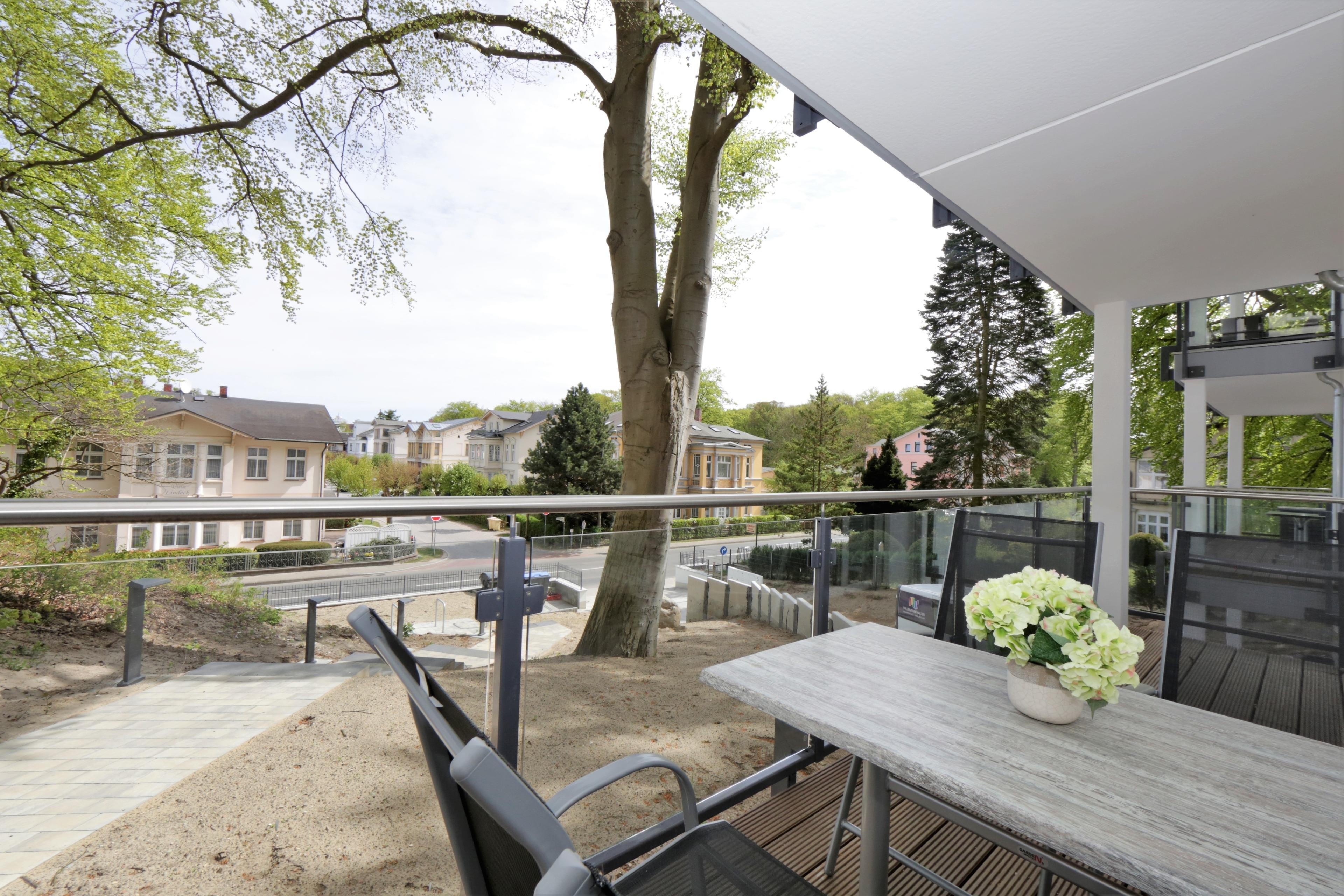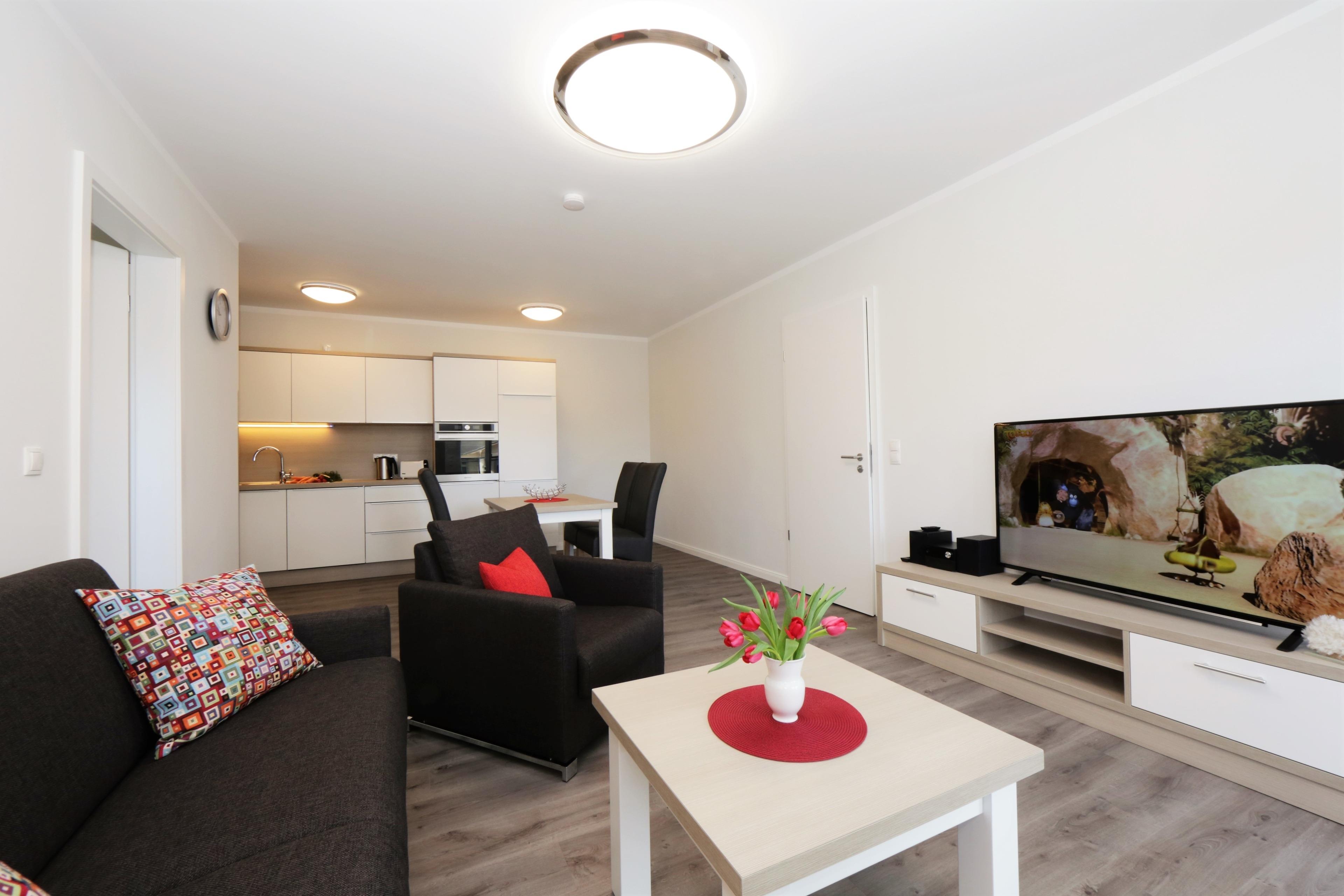Dieses hochwertige 2-Zimmer Appartement ist 58 qm groß und befindet sich im Erdgeschoss (Hanglage). Die Wohnung ist für 2-4 Personen geeignet. Im modern eingerichteten hellen Wohnbereich erwartet Sie eine behagliche Polstergarnitur mit Schlaffunktion (Matratze 160 x 200) zum Relaxen sowie ein Essplatz und ein Flat- TV mit integriertem Radio. Die im hinteren Bereich des Wohnraums integrierte Küchenzeile ist mit Induktionskochfeld, Backofen, Geschirrspülmaschine und Kühlschrank mit Gefrierfach ausgestattet und bietet viel Platz. Das ebenfalls helle Schlafzimmer verfügt über ein komfortables Doppelbett mit getrennten Matratzen (90 x 200), einen Kleiderschrank sowie einen zusätzlichen TV. Hochwertige Matratzen und Insektenschutz sorgen für einen erholsamen Schlaf. Das großzügige Badezimmer mit Fenster ist mit einer ebenerdigen Dusche und Waschtisch/WC und Haartrockner ausgestattet. Der nordöstlich ausgerichtete möblierte Balkon ist vom Wohnbereich begehbar und bietet einen weiten Blick auf Heringsdorf. Ein Strandkorb sorgt für ein wenig Abgeschiedenheit auf dem Balkon.