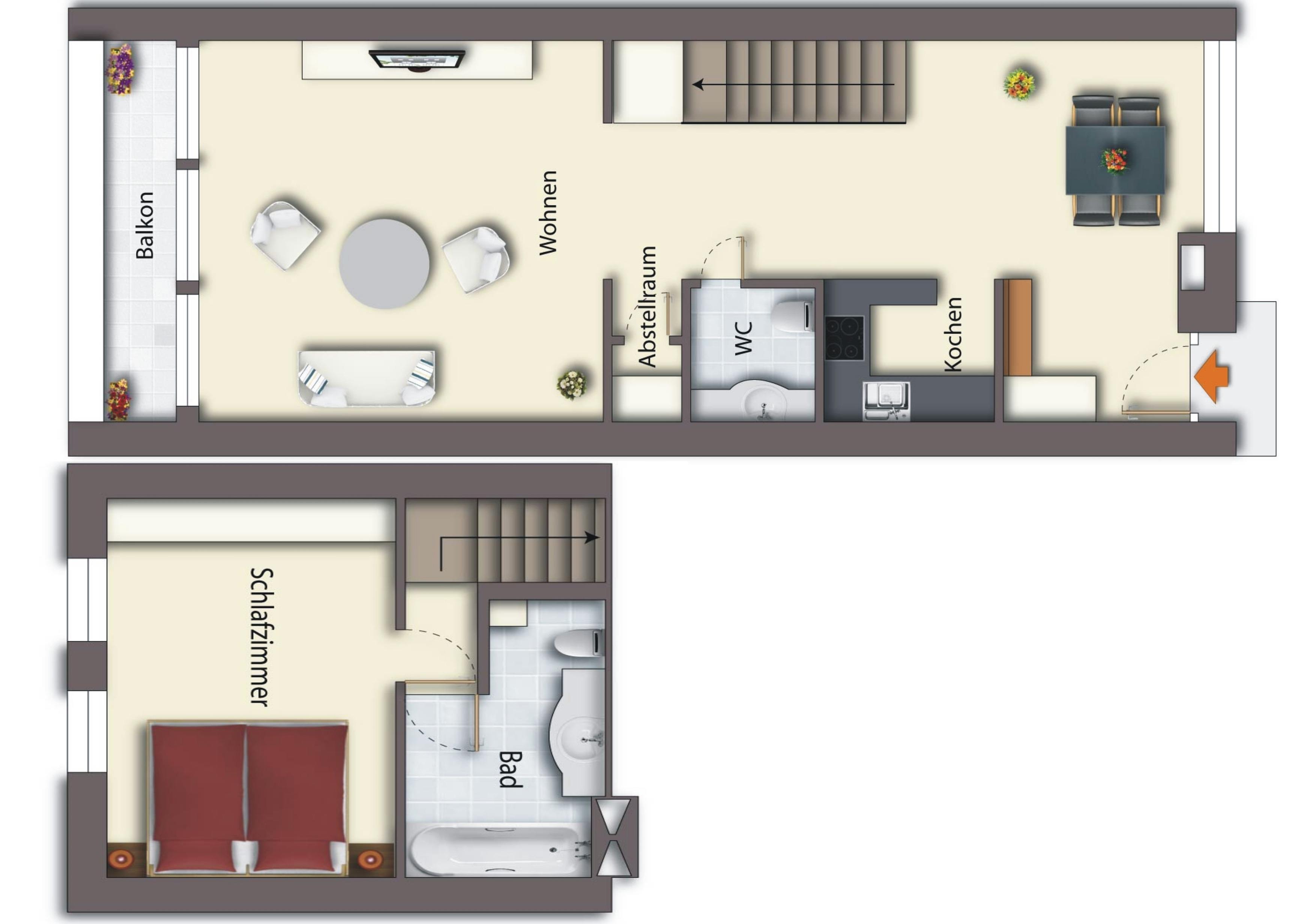 Treten Sie ein in dieses liebevoll eingerichtete Appartement, das sich über zwei Etagen erstreckt und Ihnen ein Höchstmaß an Komfort und Gemütlichkeit bietet. Vom Balkon des Wohnzimmers aus genießen Sie einen atemberaubenden Blick auf den idyllischen Schloonsee, während Sie in der gemütlichen Wohnlandschaft entspannen und Ihre Lieblingssendungen auf dem TV verfolgen können. Mit einer Schiebetür kann das Wohnzimmer vom übrigen Wohnbereich unkompliziert getrennt werden.