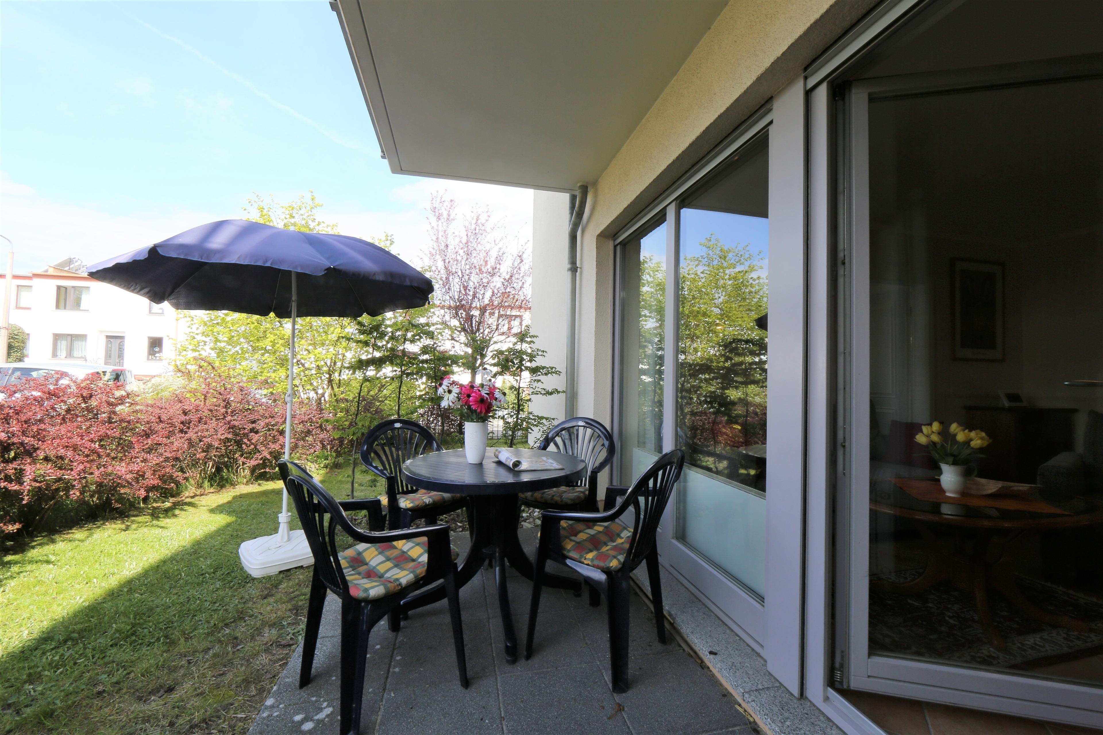 Dieses 60 qm große 3-Zimmer Appartement im Erdgeschoss eignet sich für 2 bis maximal 4 Personen. Im Wohnzimmer finden Sie eine gemütliche Couchecke mit Radio/TV, sowie einen separaten Essplatz. Die Vollküche mit Geschirrspüler, Ceranfeld, Backofen pp. ist ebenfalls offen im Wohnraum integriert. Die zum Süden ausgerichtete Terrasse ist vom Wohnraum zu begehen. Das größere Schlafzimmer ist mit einem Doppelbett mit getrennten Matratzen, das kleinere mit zwei Einzelbetten jeweils 0,90 x 2,00 m und einem Kleiderschrank ausgestattet. Im Wohnzimmer kann die Doppelbettcouch zum Schlafen genutzt werden. Das Bad bietet Dusche, sowie Badewanne und einen Doppelwaschtisch. Das WC mit Waschgelegenheit ist separat. Der Pkw-Stellplatz befindet sich auf dem Grundstück und ist der Wohnung zugeordnet. Im Keller finden Sie einen Fahrrad-Abstellraum, Münzwaschmaschine und Münztrockner.