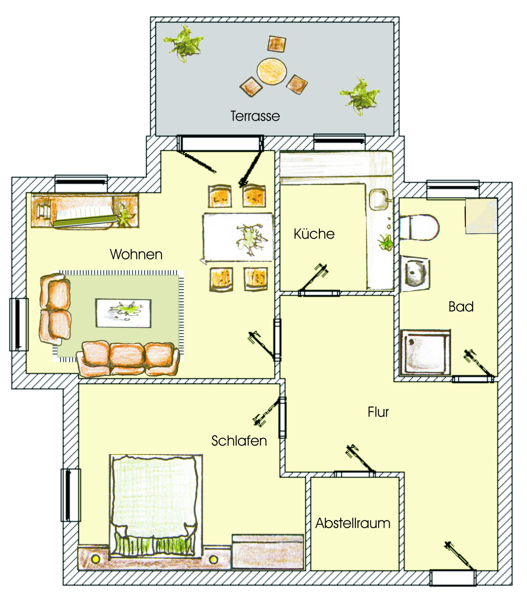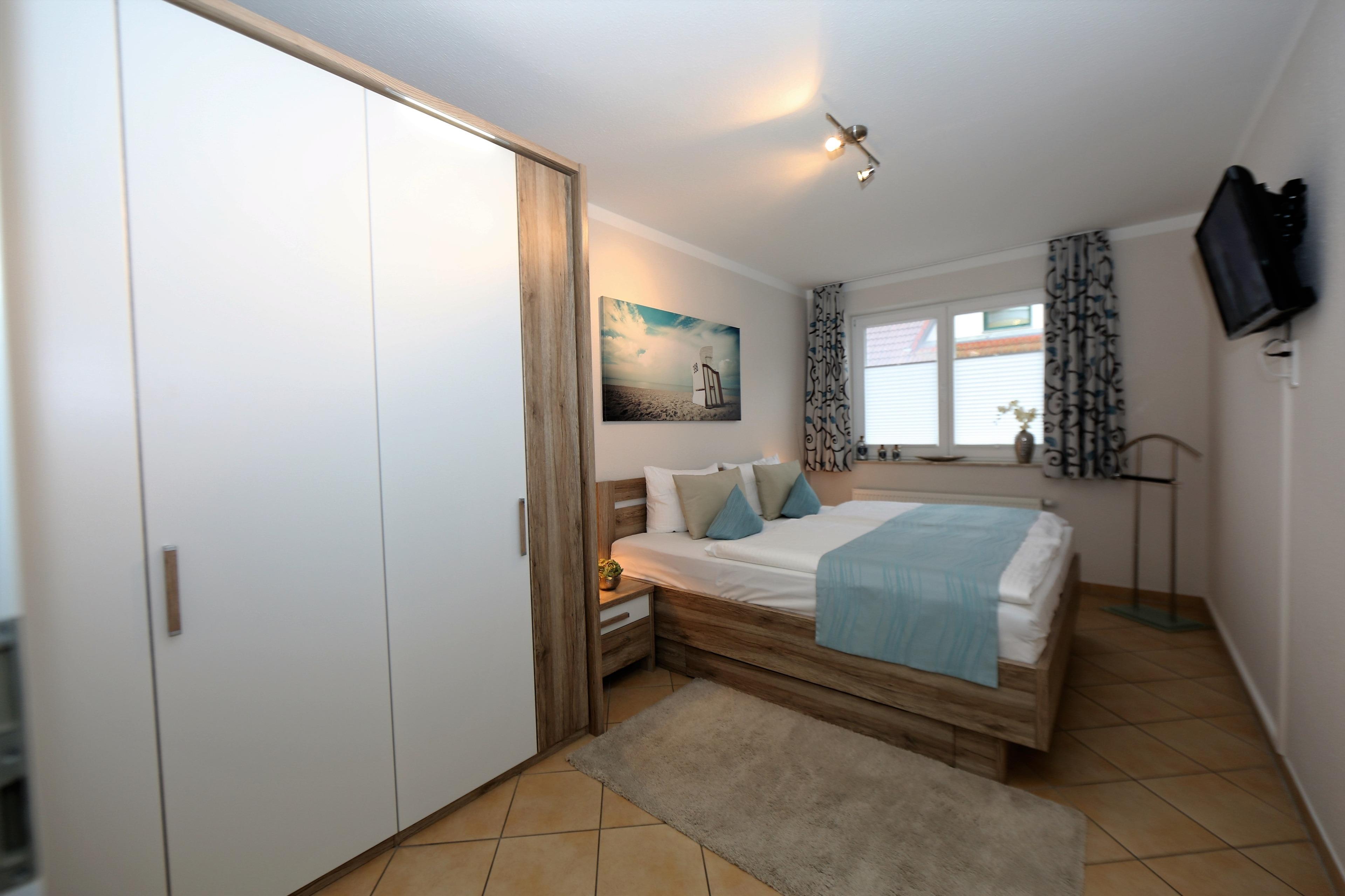 Dieses neu renovierte und gemütlich eingerichtete Zwei-Zimmer-Appartement für 2-4 Personen befindet sich im Erdgeschoss und verfügt über einen vom Wohnzimmer begehbaren überdachten Balkon zur Ostseite. Der großzügige und helle Wohnraum mit seiner gemütlichen Boxspringcouch (Liegefläche 160 x 220) lädt zum Relaxen ein. Die separate und gut ausgestattete Küche verfügt über einen Backofen mit Cerankochfeld, Geschirrspüler, Mikrowelle, Kühl-und Gefrierschrank, Kaffeemaschine etc. Das Schlafzimmer ist mit einem Doppelbett mit getrennten Matratzen (90x200) und ausreichend Schrankraum ausgestattet. Im Bad finden Sie Dusche, Waschtisch und WC, sowie eine Waschmaschine. Ein Pkw-Stellplatz befindet sich auf dem Grundstück und ist der Wohnung zugeordnet, die Fahrräder können die Gäste in einem zur Wohnung gehörenden Schuppen verschließen.