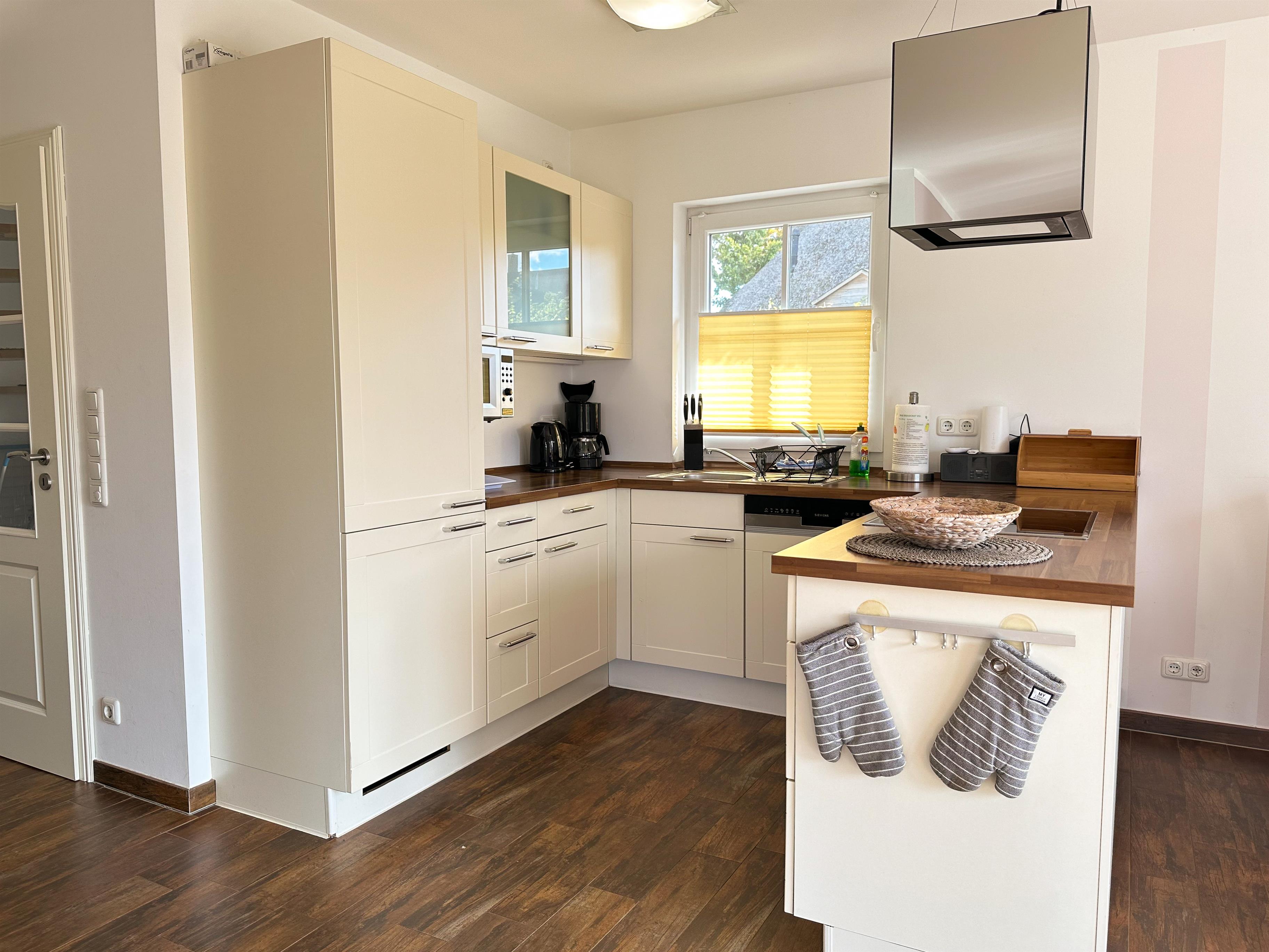 Das Fischers Hus ist ein wunderschönes Urlaubsdomizil für bis zu 7 Personen. Die 110 qm Wohnfläche verteilen sich über zwei Ebenen. Der lichtdurchflutete Wohnbereich stellt den Mittelpunkt des Hauses dar. Beim Betreten Wohnbereichs empfängt Sie sofort ein Gefühl der Entspannung. Die Ledergruppe bietet Platz, um nach einem ereignisreichen Tag gemütlich die Beine hochzulegen und zur Ruhe zu kommen. Hier können Sie gemeinsam mit Ihren Liebsten entspannen, ein gutes Buch lesen oder vor dem modernen Flat-TV den Abend ausklingen lassen. Für eine besonders behagliche Atmosphäre sorgt der Kaminofen, der nicht nur zusätzliche Wärme spendet, sondern auch das Ambiente mit seinem knisternden Feuer verzaubert. An kühleren Tagen bietet er den perfekten Ort, um sich mit einer heißen Tasse Tee oder einem Glas Wein zurückzulehnen und die wohlige Gemütlichkeit zu genießen.