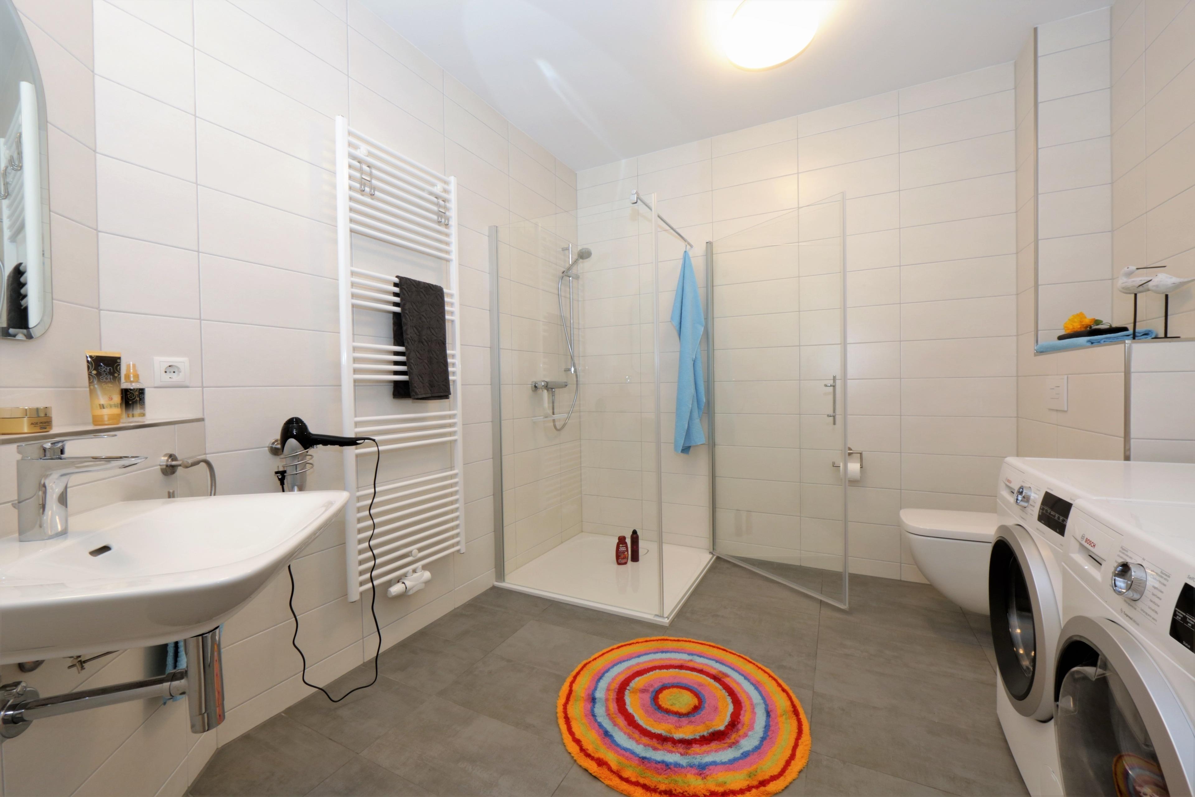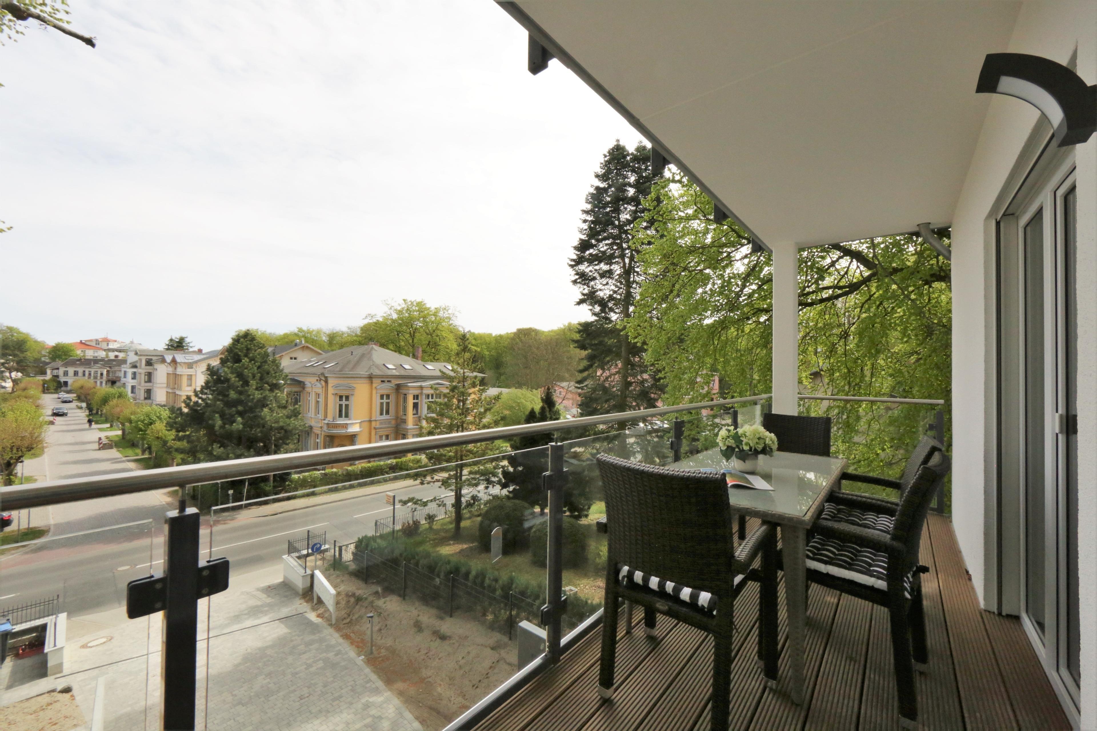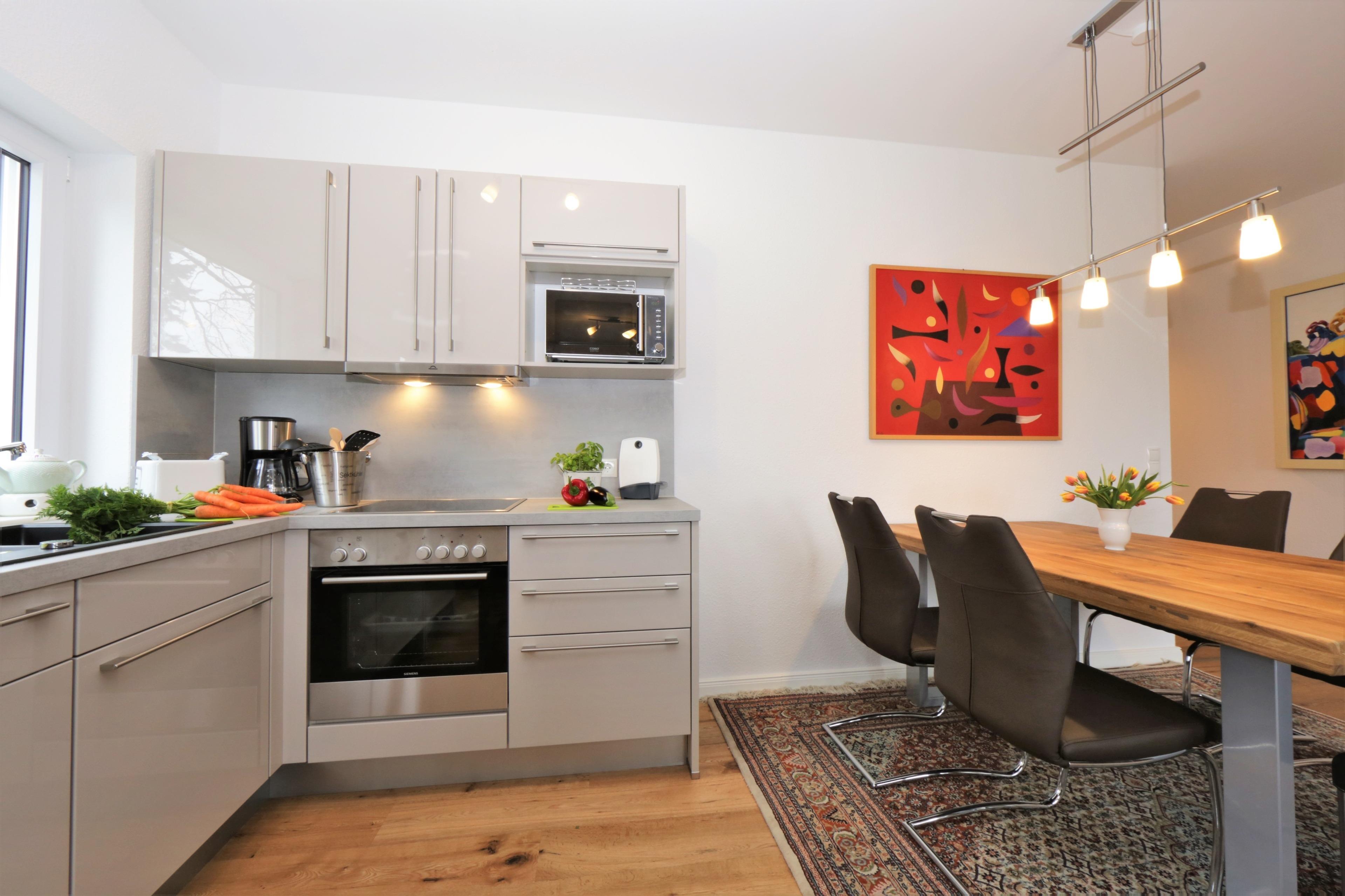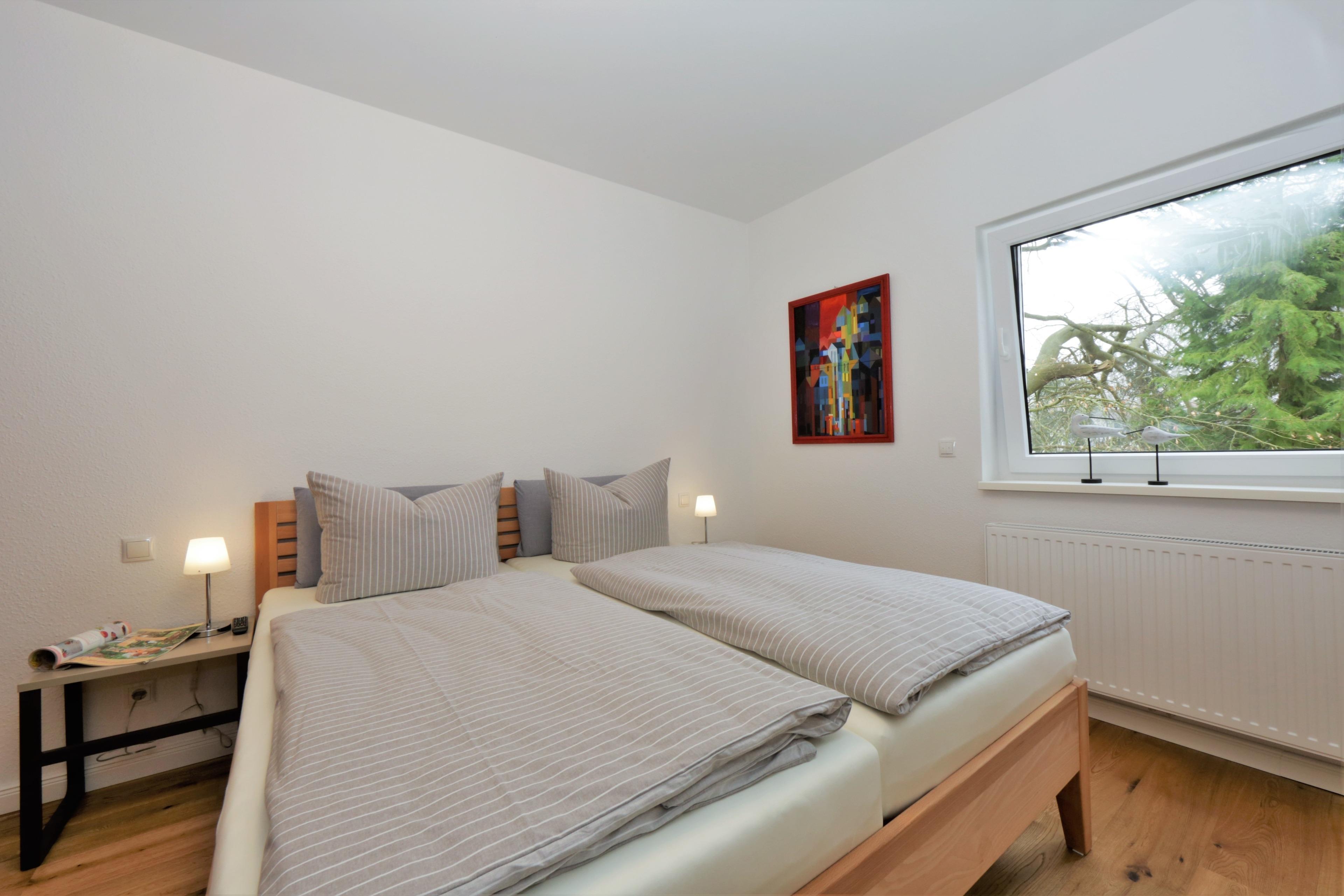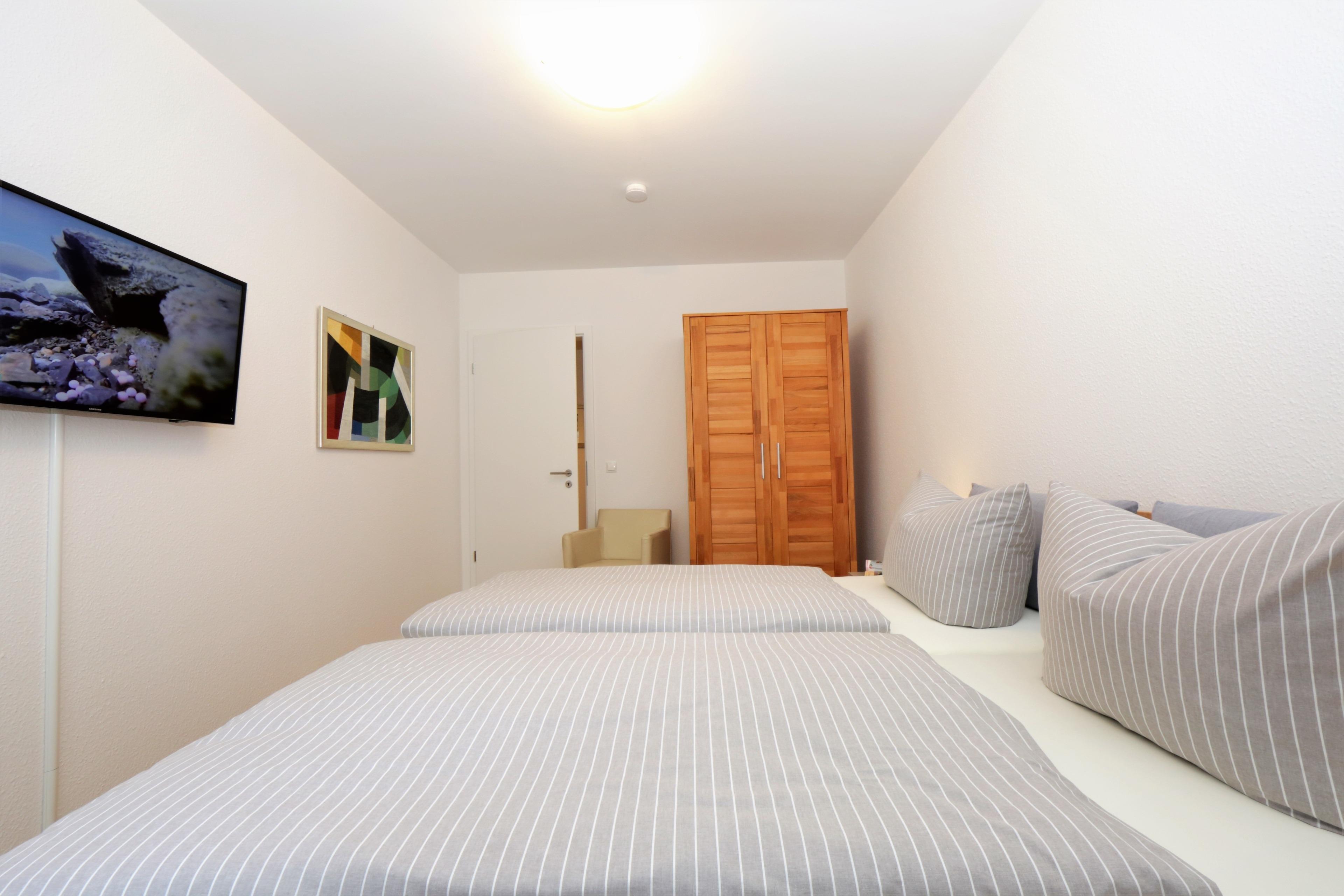 Dieses mit 90 qm großzügige 3-Zimmer Appartement befindet sich im 1. Obergeschoss und eignet sich für 4 Personen. Der helle Wohnraum erwartet seine Gäste mit einer modernen Ledergarnitur zum Relaxen. Flat- TV ist selbstverständlich. Der Essplatz sowie die Küche befinden sich ebenfalls im Wohnraum. Die Küche ist mit Cerankochfeld, Backofen, Mikrowelle, Geschirrspülmaschine und Kühlschrank ausgestattet. Der nordöstlich ausgerichtete Balkon lockt Sie bereits zum Frühstück ins Freie. Die Schlafzimmer sind mit einem Doppelbett, einem Kleiderschrank und einmal mit Schreibtisch eingerichtet. Das moderne Badezimmer ist mit einer Dusche, einem Waschtisch und WC ausgestattet. Hier stehen den Gästen außerdem Waschmaschine und Trockner zur Verfügung. Dem Appartement ist ein Pkw-Stellplatz in der Tiefgarage zugeordnet.