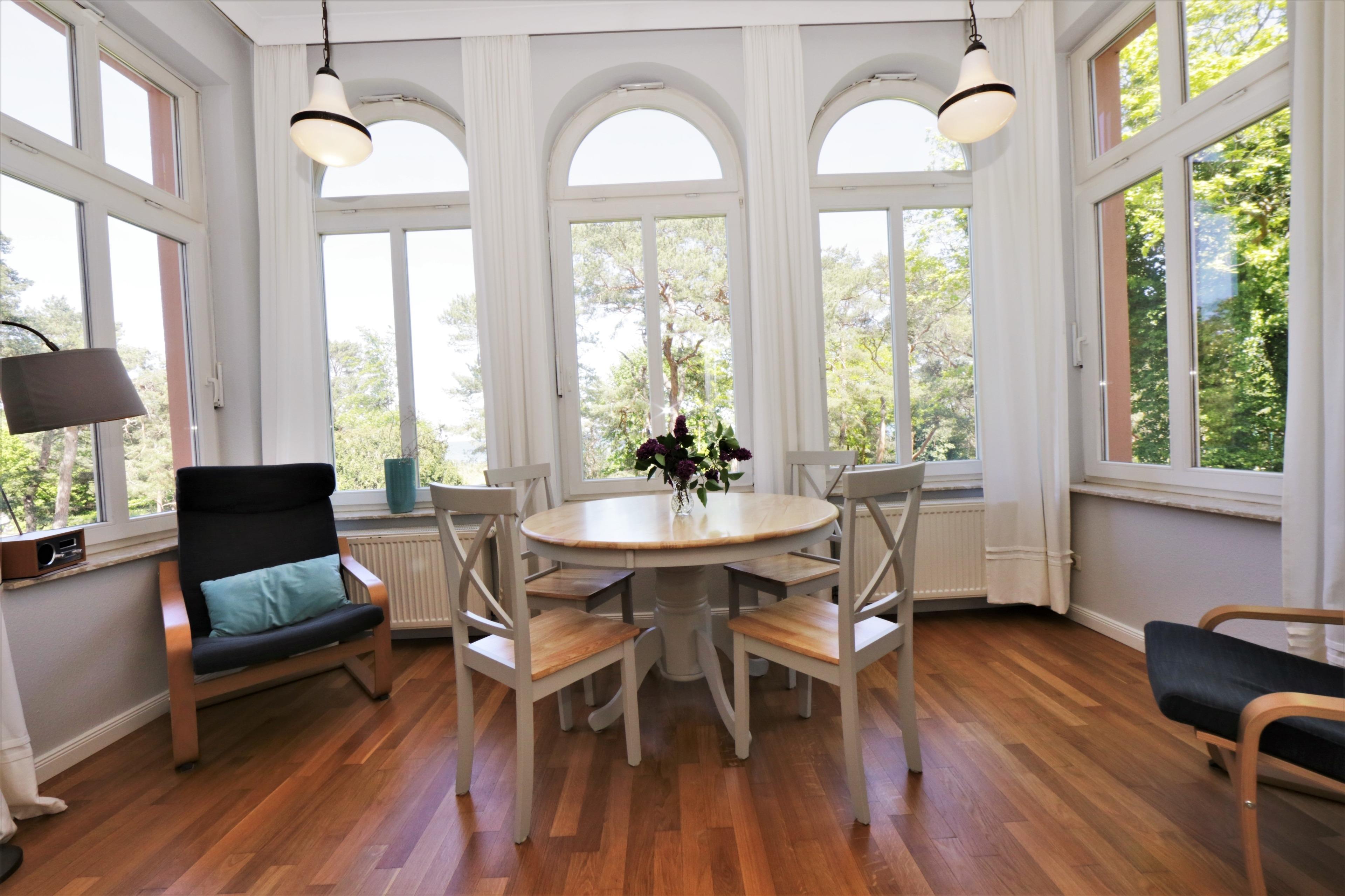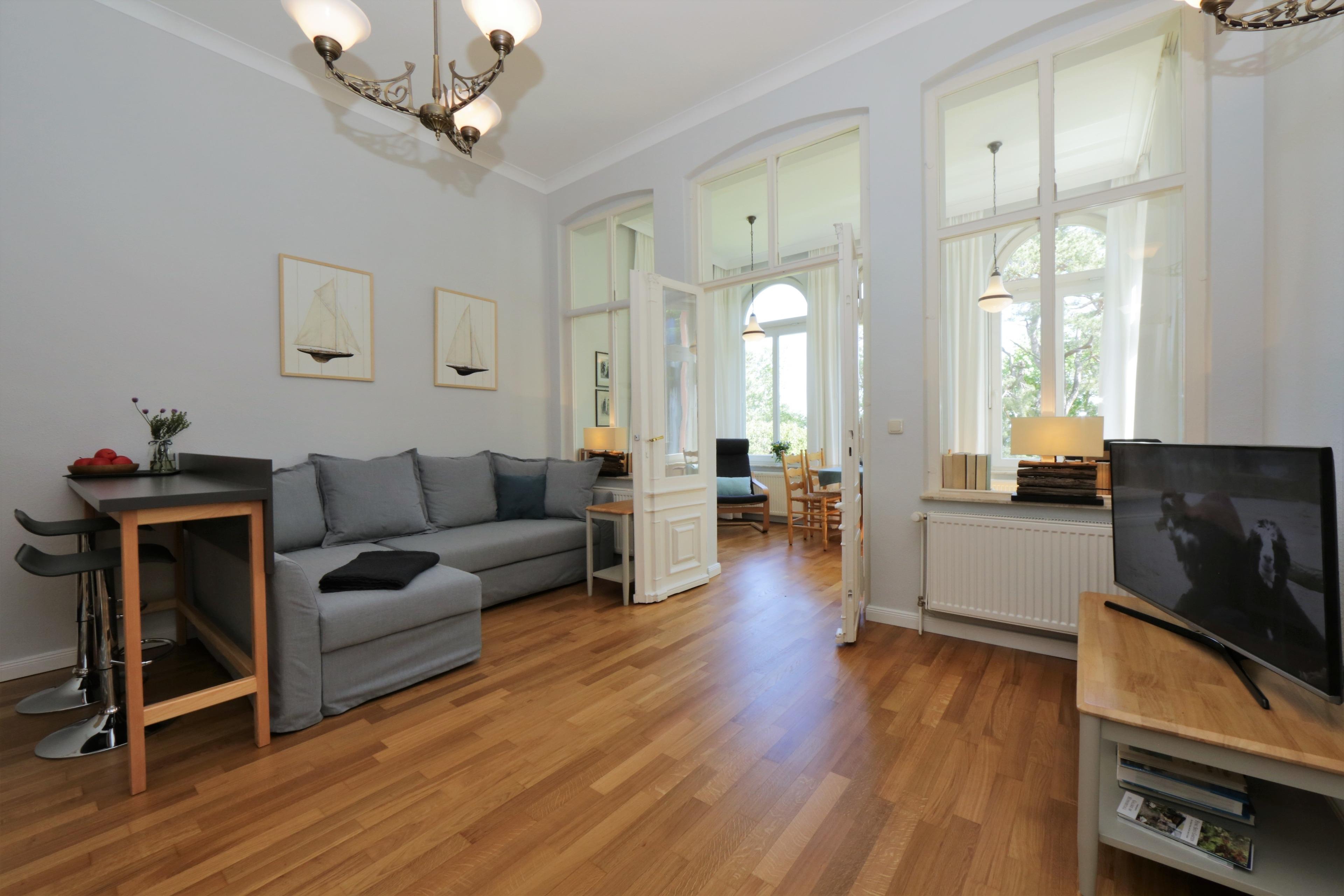 In diesem geschmackvoll eingerichteten 52 qm großen 2-Zimmer-Appartement können 2-3 Personen einen erholsamen Aufenthalt direkt am Meer verleben. Das Wohnzimmer ist mit einer modernen Couch und Flat TV möbliert. Die angrenzende, geschlossene Loggia (Fenster lassen sich öffnen) mit teilweisem Blick auf die Ostsee und die Promenade ist zu jeder Tageszeit ein beliebter Platz. Hier lädt ein Essplatz zu gemeinsamen Mahlzeiten und ein Relaxsessel zur Urlaubslektüre ein. Die Küchenzeile mit Geschirrspüler, Backofen, Cerankochfeld etc. ist zusammen mit einem Tresen und zwei Barhockern im hinteren Bereich des großzügigen Wohnraumes offen integriert. Das Schlafzimmer, aus dessen Fenster man ebenso einen Blick auf das Meer erhaschen kann, ist mit einem Doppelbett mit getrennten Matratzen (Topper 180 x 200) und einem Kleiderschrank ausgestattet. Das moderne kleine Bad, das vom Schlafzimmer und vom Flur begehbar ist, ist mit einer Dusche mit Echtglasabtrennung und Waschbecken/WC ausgestattet. Waschmaschine und Trockner sind im Haus vorhanden. Ein Pkw-Stellplatz befindet sich auf dem Grundstück und ist der Wohnung zugeordnet.