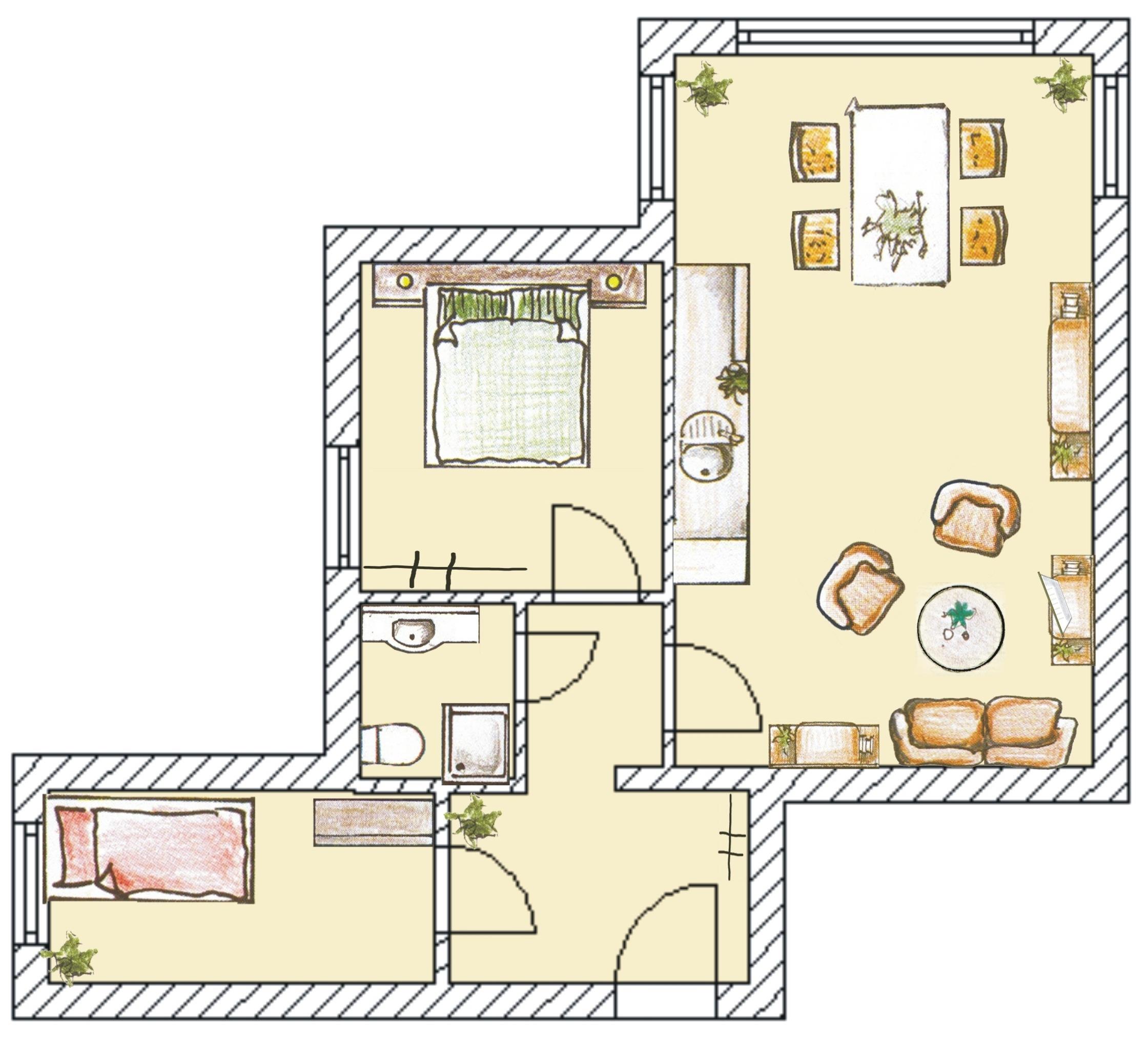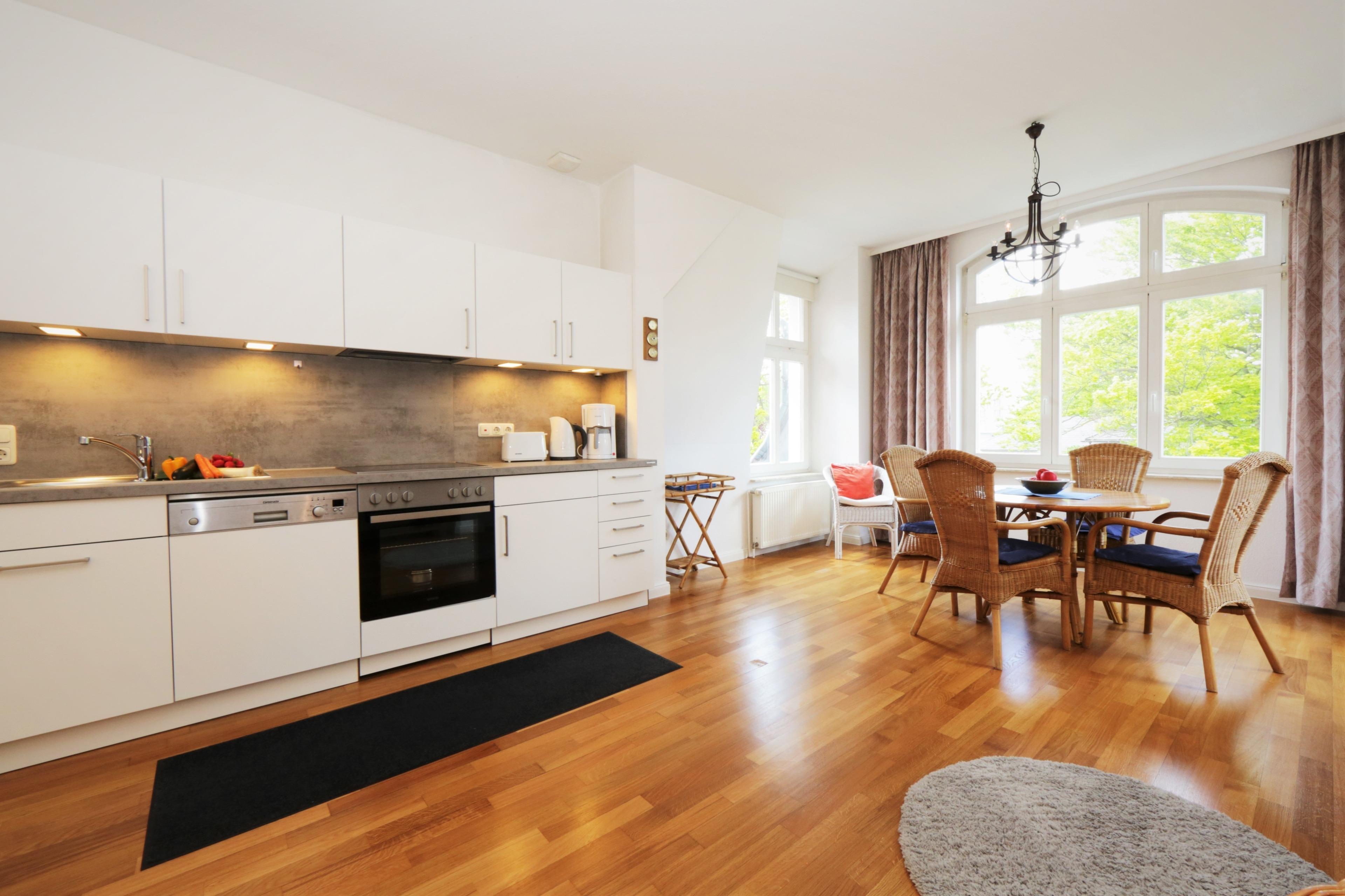 Dieses 58 qm große Appartement ist eine 3-Zimmer-Wohnung im 2. Obergeschoss mit herrlichem Ostseeblick. Im Wohnzimmer lädt eine gemütliche Couch mit Sessel zum Entspannen und Fernsehen ein. Die lichtdurchflutete, geschlossene Loggia (Fenster lassen sich öffnen) zum Westen schließt sich offen direkt an die Sitzgruppe an und beherbergt einen Essplatz für bis zu 4 Personen. Von hier aus können Sie einerseits einen herrlichen Blick auf die Promenade und das Meer genießen, andererseits jedoch auch den schönen Blick in den Garten. Die Küchenzeile mit Kühlschrank, Geschirrspüler, Backofen, Cerankochfeld etc. ist ebenfalls offen im Wohnraum integriert. Das Schlafzimmer ist mit einem Doppelbett mit getrennten Matratzen (80 x 200) und einem Kleiderständer, ein zweites kleineres Schlafzimmer ist mit einem Einzelbett (90 x 200) und einem Schrank eingerichtet. Das Bad ist mit Dusche und Waschbecken/WC ausgestattet. Waschmaschine und Trockner sind im Haus vorhanden. Ein Pkw-Stellplatz befindet sich auf dem Grundstück.