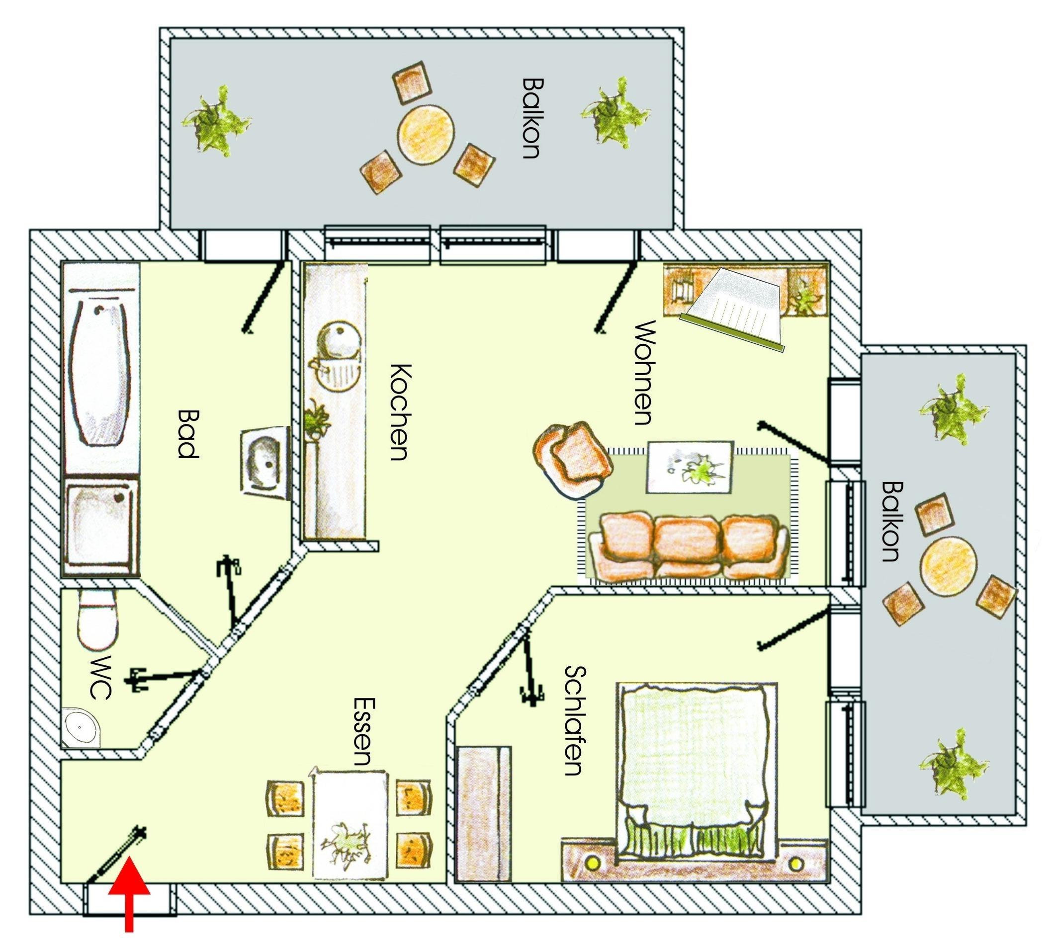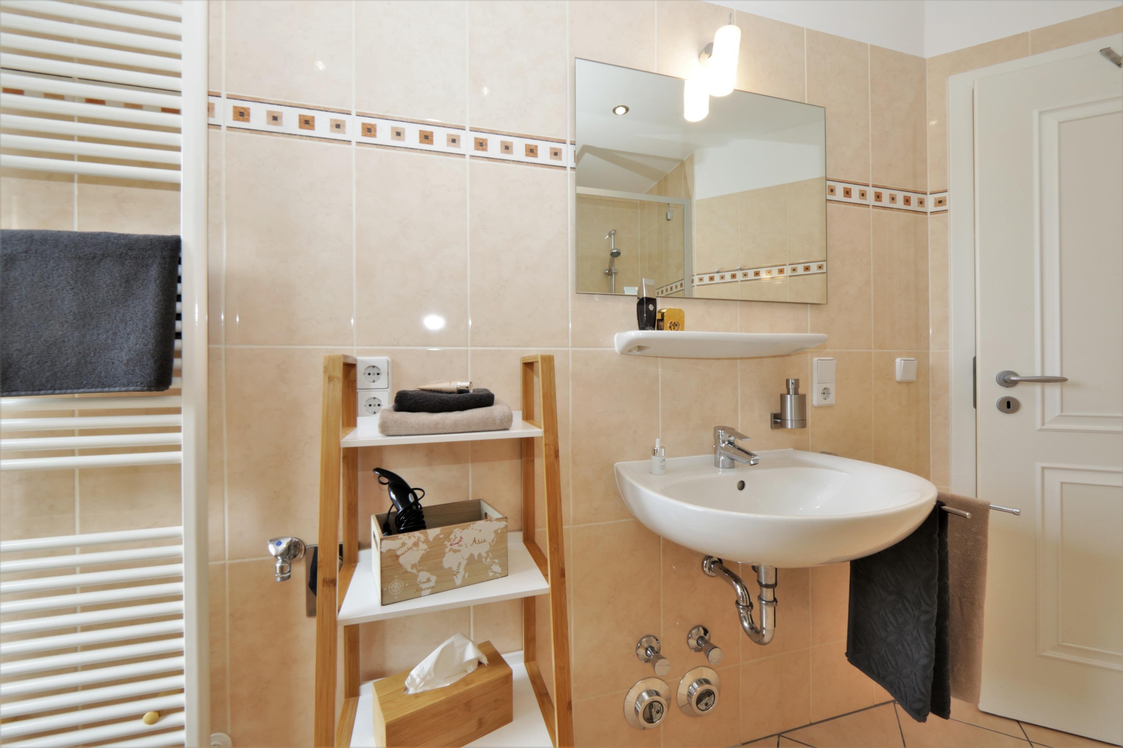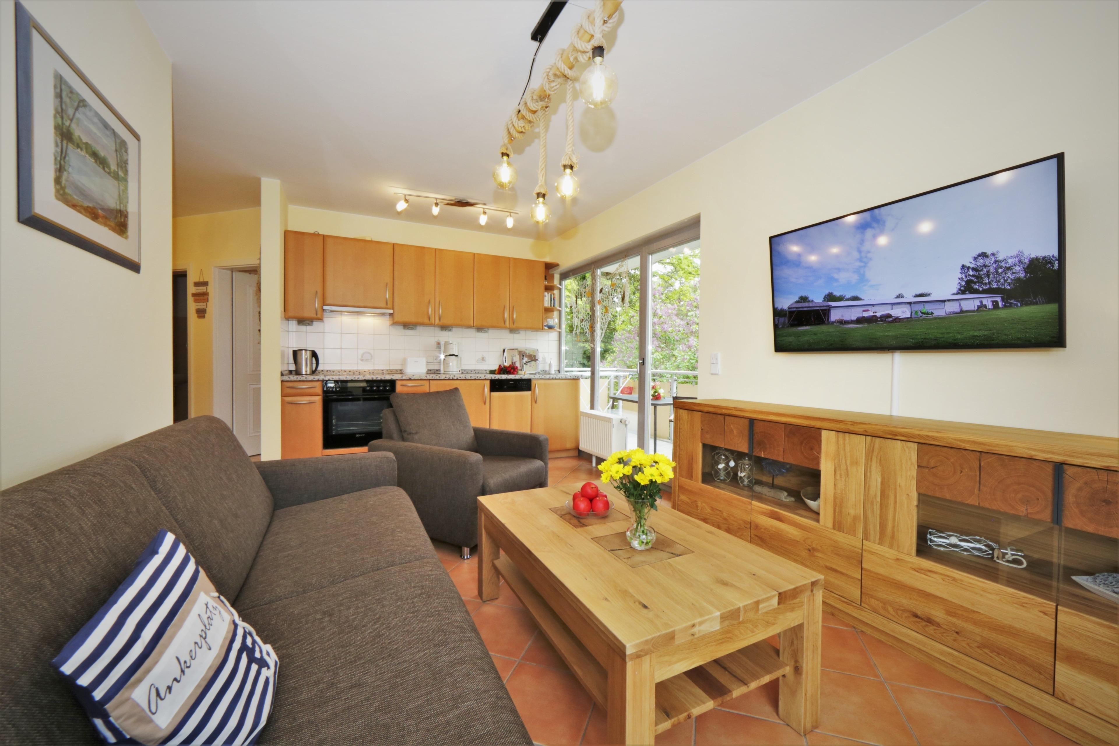 Dieses 49 qm große 2-Zimmer Appartement im 1. Obergeschoss ist liebevoll mit hochwertigen Echtholzmöbeln eingerichtet und eignet sich für 2 bis 4 Personen. Im vorderen Bereich des Wohnraums steht den Gästen eine gemütliche Couchecke mit Schlaffunktion (Matratze 160 x 200) und Flat-TV zur Verfügung. Zwei Balkone, die beide vom Wohnraum zu begehen und zum Süden und Südosten gerichtet sind, laden zu erholsamen Sonnenstunden und Mahlzeiten im Freien ein. Der gemütliche Essplatz befindet sich in der Diele. Ebenfalls im Wohnraum integriert ist die Vollküche incl. Kühlschrank, Geschirrspüler, Ceranfeld, Backofen etc. Das Schlafzimmer ist mit einem Boxspringbett mit getrennten Matratzen (90 x 200), und einem Kleiderschrank möbliert. Den Gästen steht ein zusätzlicher TV zur Verfügung. Das Bad bietet Ihnen sowohl Dusche als auch Badewanne, ein Waschbecken und reichlich Ablage. Direkt neben dem Bad befindet sich das separate WC. Die Balkone lassen sich auch vom Schlafzimmer und vom Bad aus benutzen. Der Pkw-Stellplatz befindet sich auf dem Grundstück und ist der Wohnung zugeordnet. Im Keller finden Sie einen Fahrrad-Abstellraum, Münzwaschmaschine und Münztrockner. In diesem Appartement sind Haustiere erlaubt.