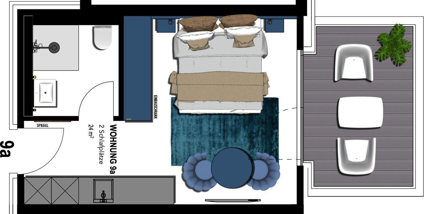 1-Raum Ferienwohnung mit Balkon, Bad mit Dusche, Küche mit Cerankochfeld, Kühl-Gefrierkombination, Geschirrspüler und Mikrowelle, Smart-TV, Boxspringdoppelbett, Nichtraucher