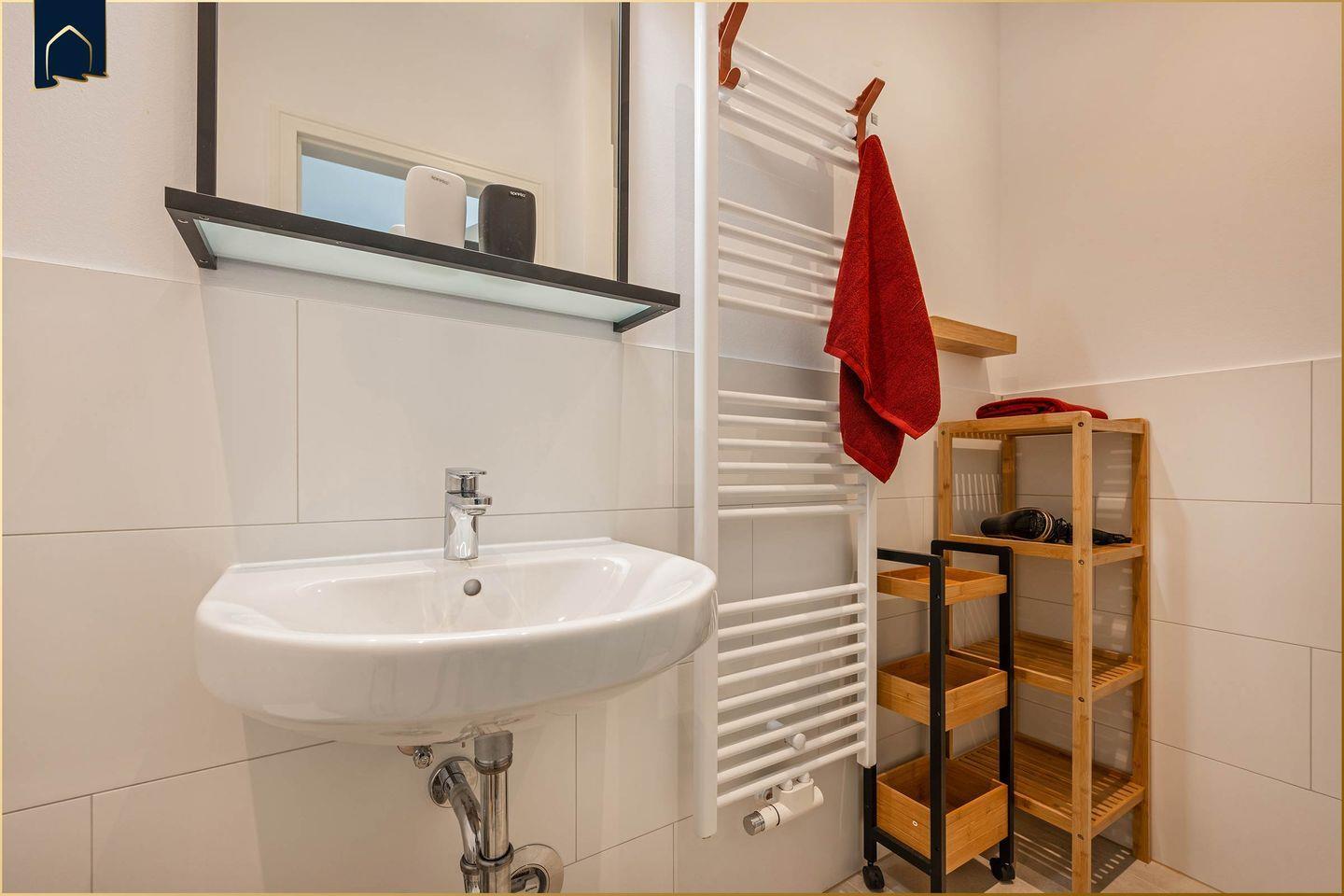 Auch die Küche ist voll ausgestattet – inklusive Herd, Backofen, Mikrowelle, Kühlschrank mit Gefrierfach, Spülmaschine, Kaffeemaschine, Toaster und Wasserkocher. Der angrenzende Essbereich mit Esstisch schafft den perfekten Rahmen für gemeinsame Mahlzeiten. Im Badezimmer erwartet Sie eine moderne Dusche, Waschbecken und WC. Zusätzlich stehen Ihnen praktische Ausstattungsmerkmale wie Waschmaschine, Staubsauger, Bügelbrett und Haartrockner zur Verfügung.