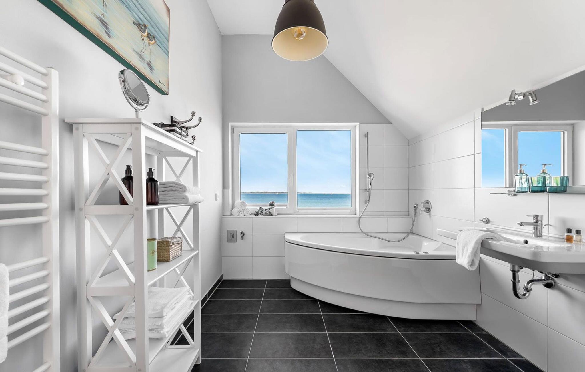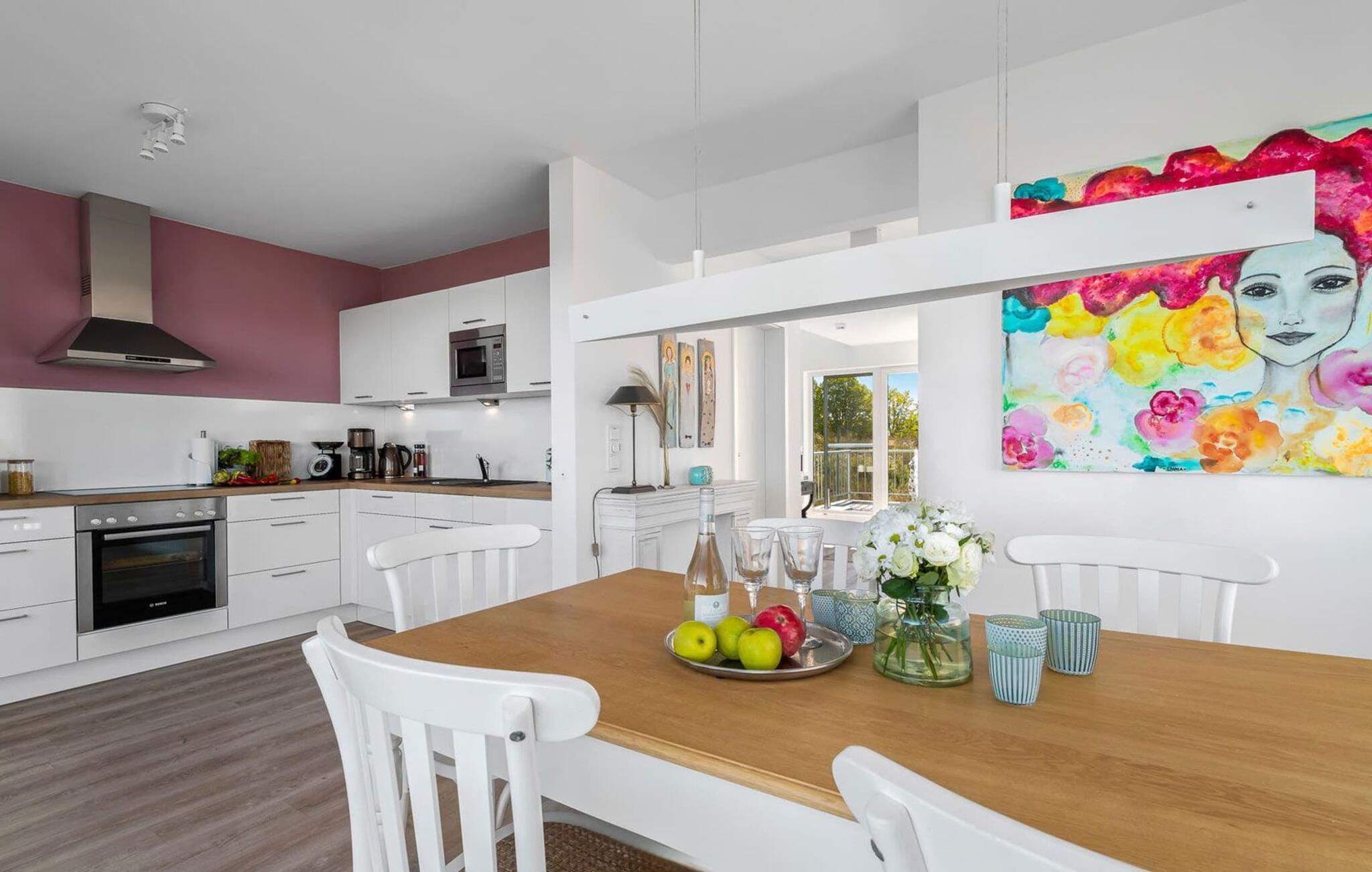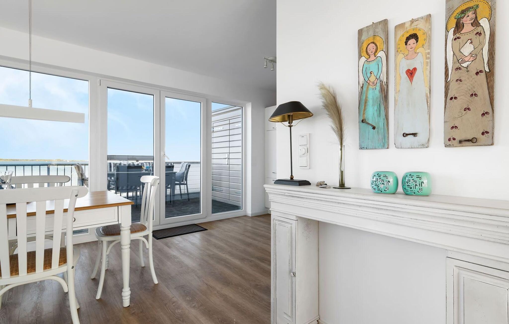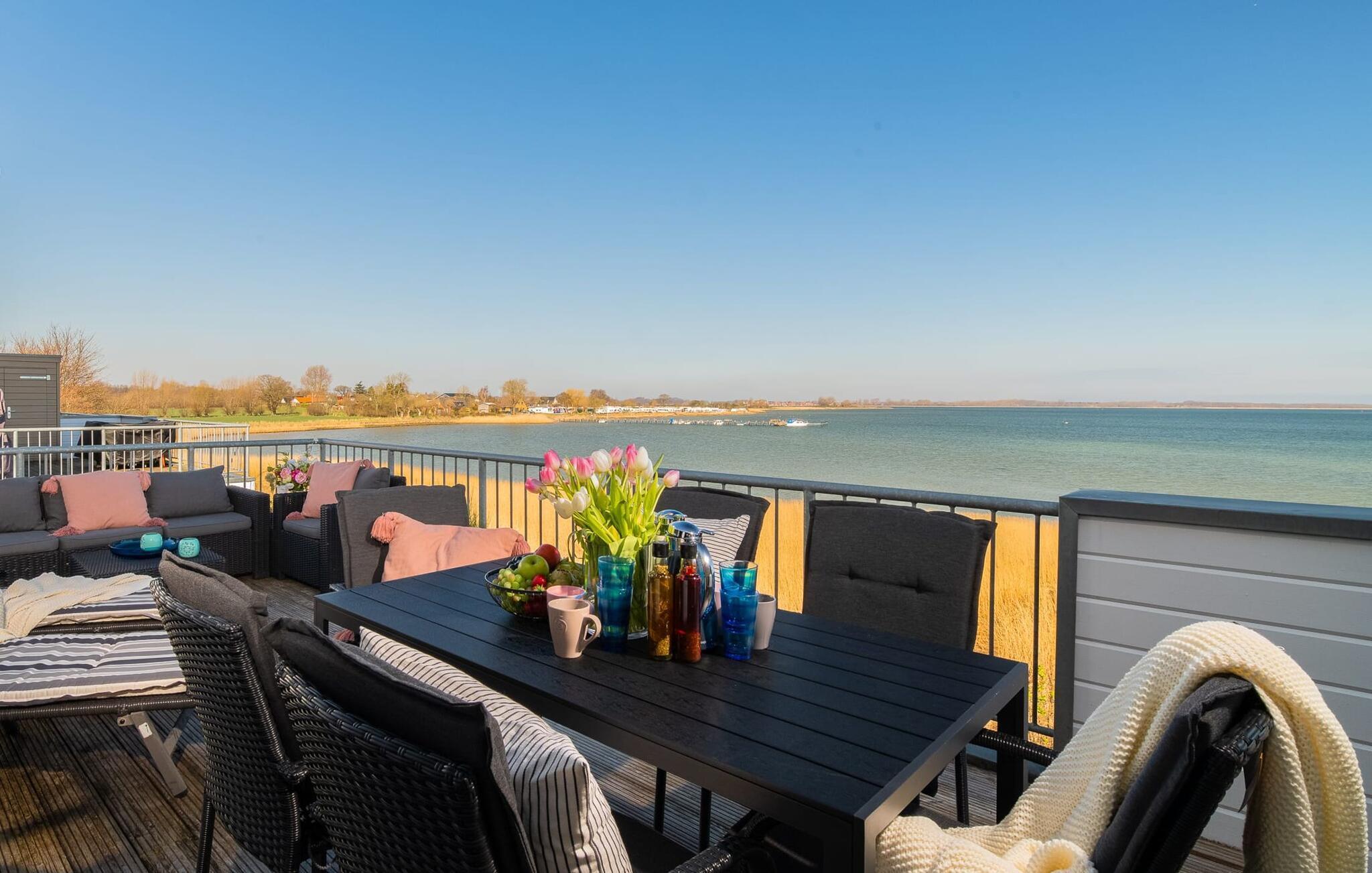 Den innbydende ferieleiligheten strekker seg over to fortryllende nivåer og ligger i en moderne villa med spa-arkitektur rett ved den pittoreske bredden av Schlei. Herfra har du en fantastisk utsikt over de milde bølgene og de vakre naturomgivelsene. Det fint koordinerte maritime fargeskjemaet og utsikten over vannet, åkrene og engene skaper avslapping, rekreasjon og indre kontemplasjon så snart du kommer inn i ferieleiligheten - de beste forutsetninger for avslappende dager. Den smakfulle innredningen går igjen i hele leiligheten. Dette er den ideelle rammen for en herlig ferie ved Østersjøen.