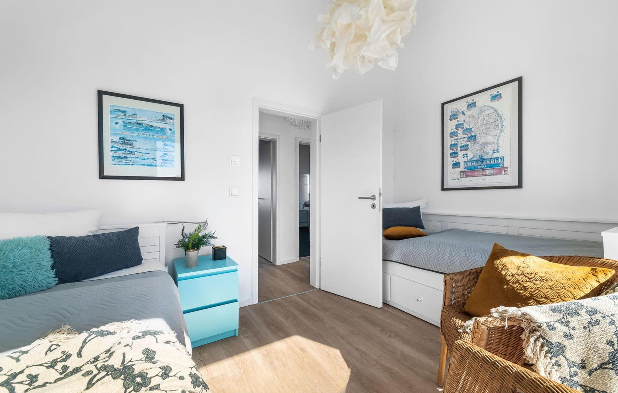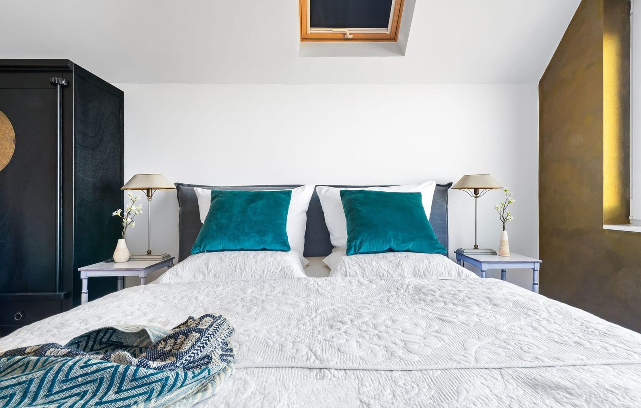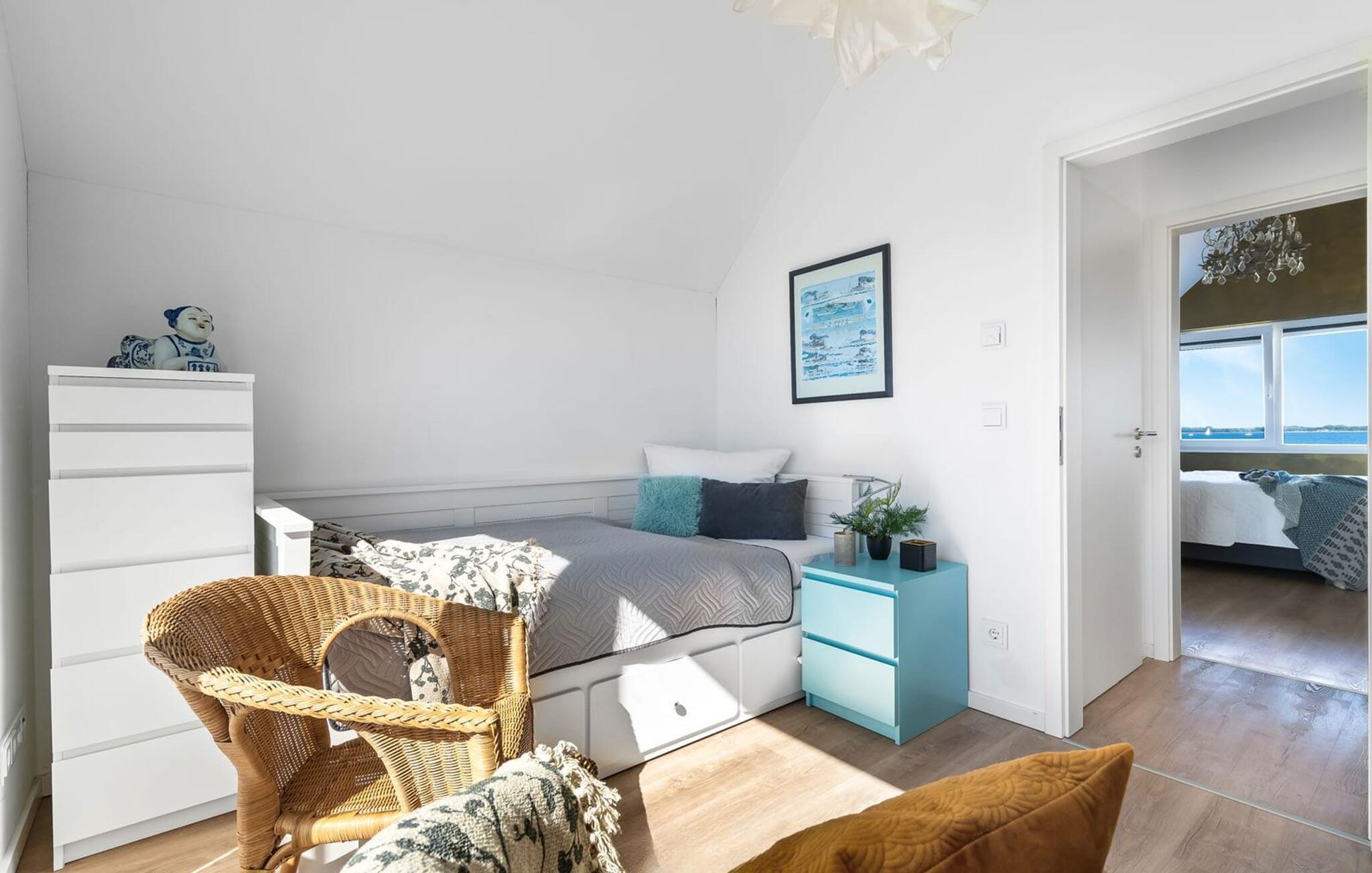 På leilighetens øverste plan ligger to sjarmerende soverom. Hovedsoverommet briljerer med en komfortabel dobbeltseng med fjærfjærer, og lover luksusen av å våkne opp og sovne med utsikt over bredden av Schlei. Et takvindu over sengen gir også en drømmende utsikt over himmelen og de store nordiske skyene, dagdrømmer inkludert. En praktfull lysekrone gir rommet et spesielt preg. Det andre soverommet har to separate senger, er gjennomstrømmet av lys og har en uovertruffen utsikt over det idylliske landskapet.