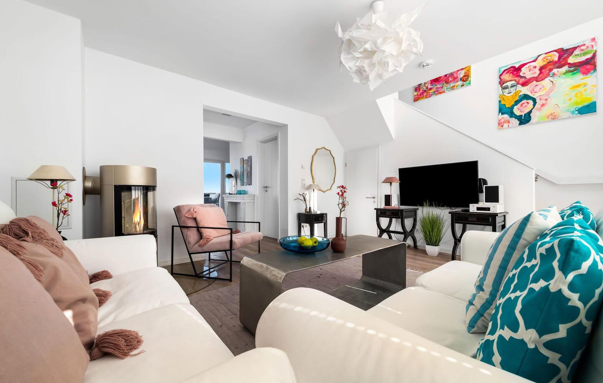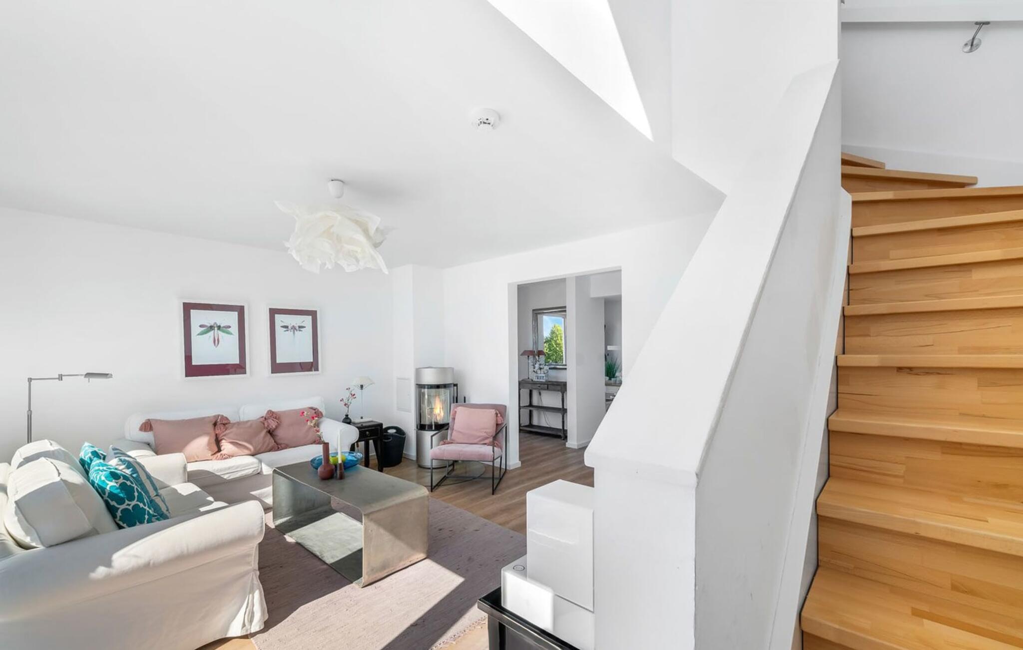 Leilighetens underetasje består av et romslig oppholdsrom med panoramavinduer fra gulv til tak som gir utsikt over Schlei og dens bredder. En tilstøtende terrasse og en innbydende vedovn gjør dette rommet til et perfekt tilfluktssted. Her kan du lene deg tilbake, nyte velduftende te, legge planer eller bare slappe av - alt er mulig.