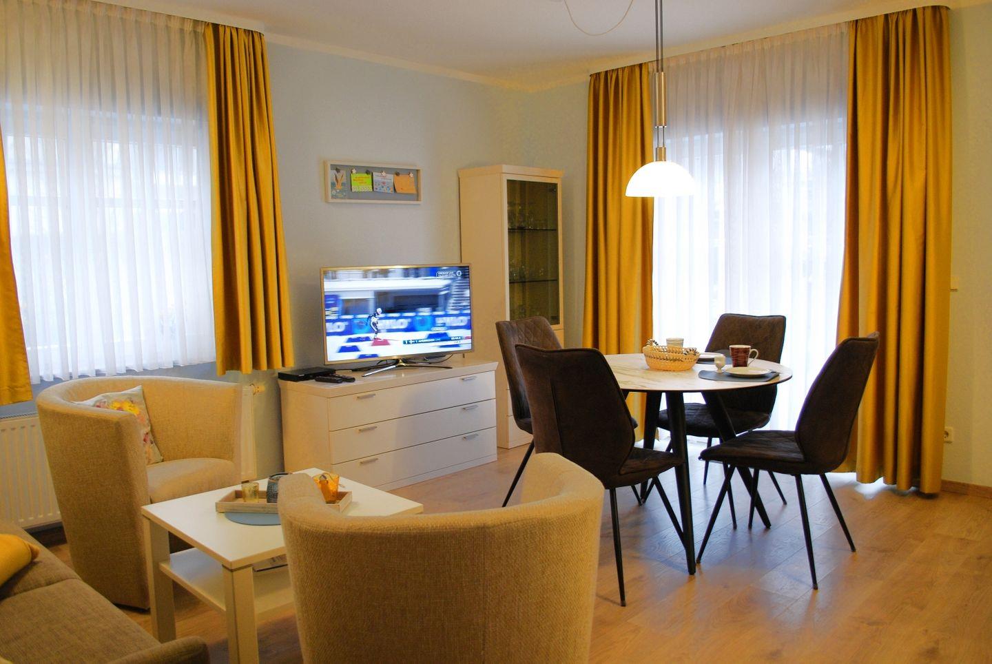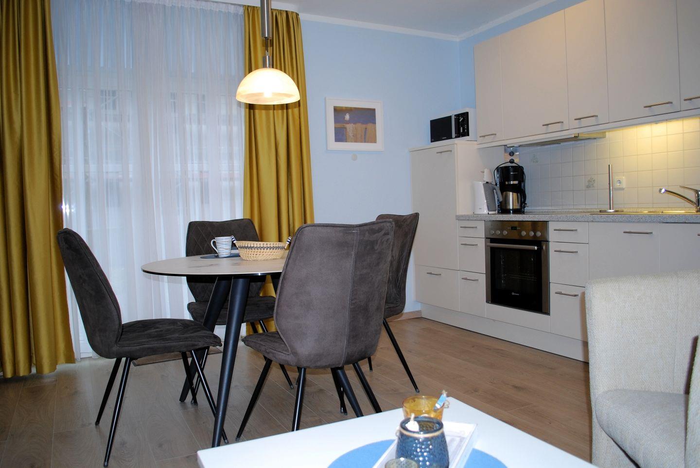 Die 45 m² große Erdgeschoss-Ferienwohnung ist gehoben ausgestattet und verfügt über einen großzügigen Wohnbereich mit Schlafcouch, offener voll ausgestatteter Küchenzeile und Essplatz, einen Schlafraum (Doppelbett) und ein Duschbad. Es stehen kostenfreies Wlan und ein PKW-Stellplatz zur Verfügung. Haustiere sind leider nicht gestattet.