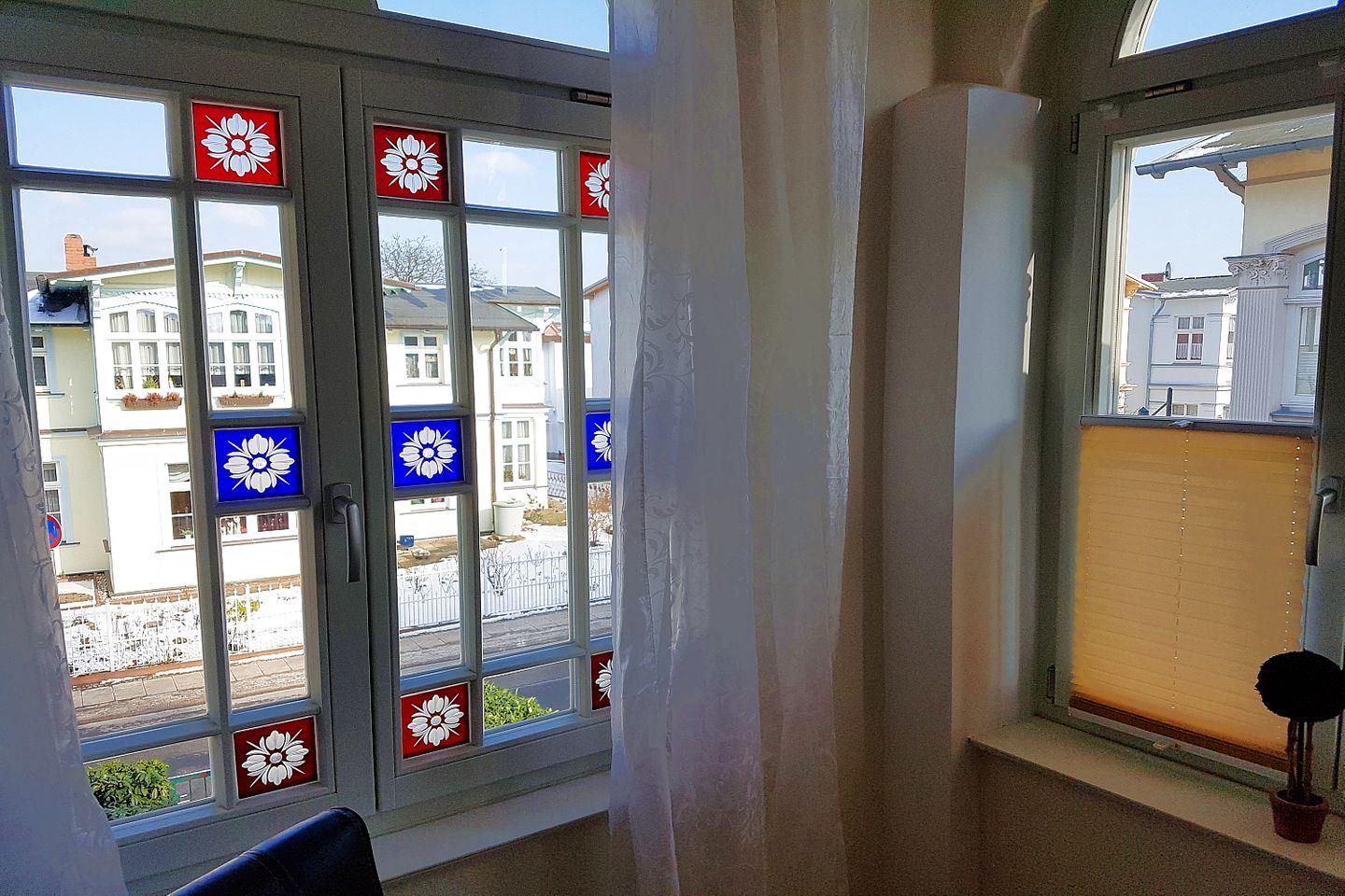 Die geräumige und helle 62 m² große Wohnung befindet sich im 1. OG des Hauses. Das Appartement ist geschmack- und liebevoll eingerichtet und verfügt über einen Wohnraum mit Schlafcouch, offener voll ausgestatteter Küchenzeile und Essplatz sowie eine Veranda, einen Schlafraum