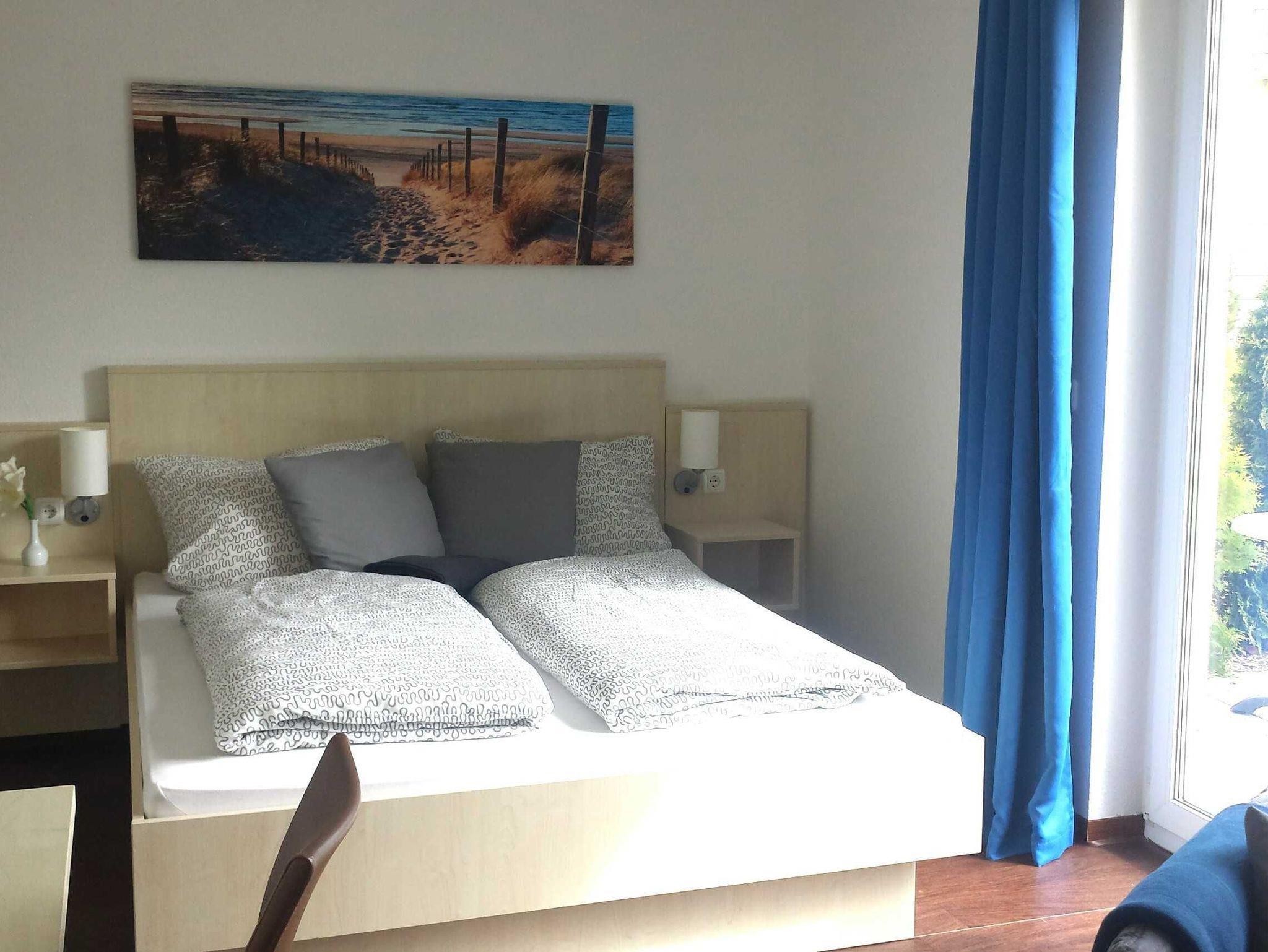 - Das größere Zimmer (ca. 22m²) ist mit einem Doppelbett (180x200) ausgestattet und hat eine integrierte Mini-Küche, von diesem Zimmer gelangt man auf die Terrasse mit angrenzender Grünfläche.