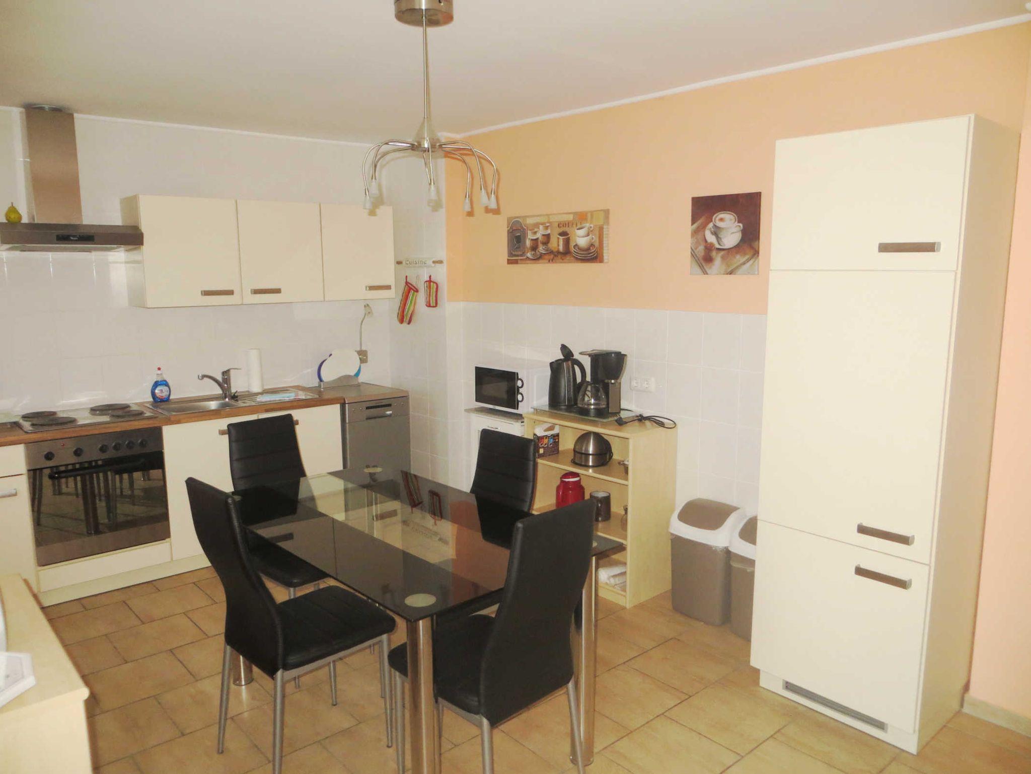 Die Küche mit Essecke ist komplett ausgetattet unter anderem mit einem Herd (4 Platten), einer Backröhre, einem Kühlschrank, einer Mikrowelle, einem Geschirrspüler, einer Kaffeemaschine und einem Wasserkocher. Im Schlafzimmer stehen ein Doppelbett und ein Kleiderschrank.