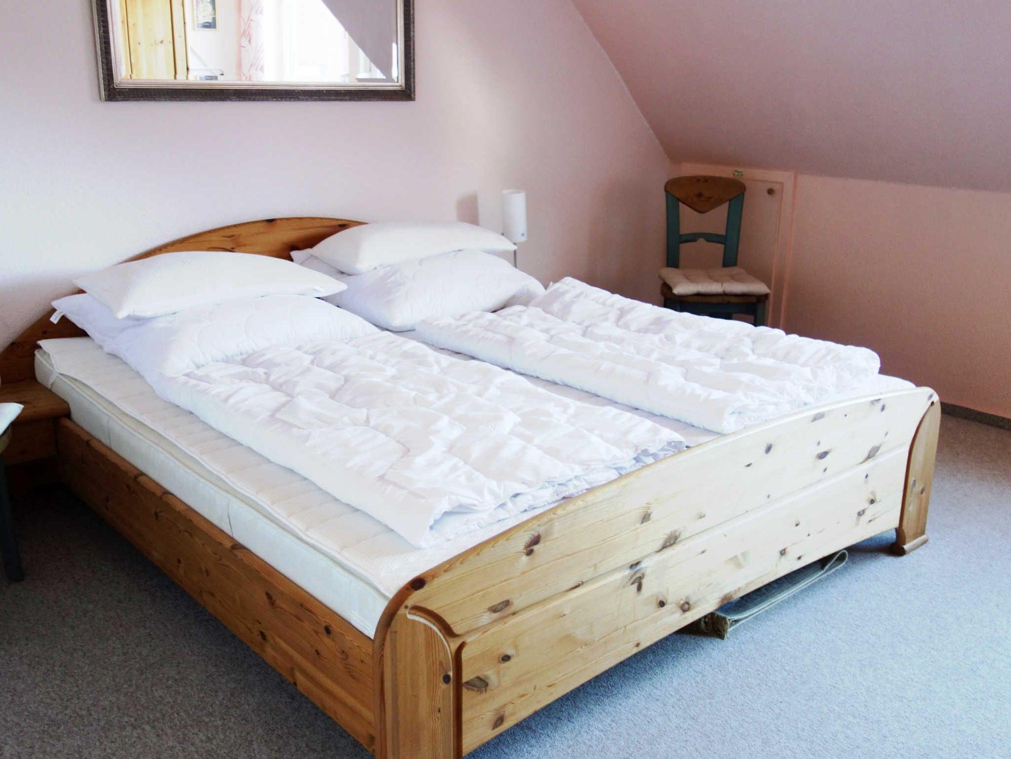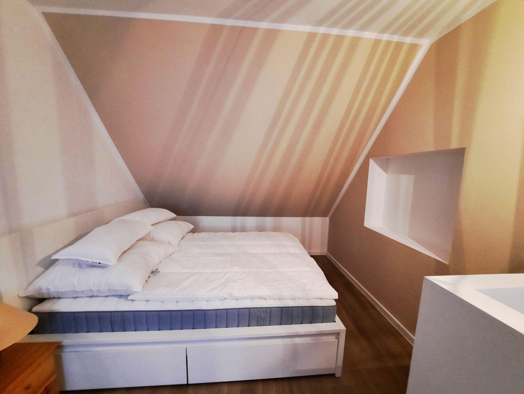 Über eine kleine, steile Treppe erreicht man das zweite Schlafzimmer. Ebenfalls im oberen Wohnbereich gibt es ein weiteres Badezimmer mit WC und ebenerdiger Dusche.