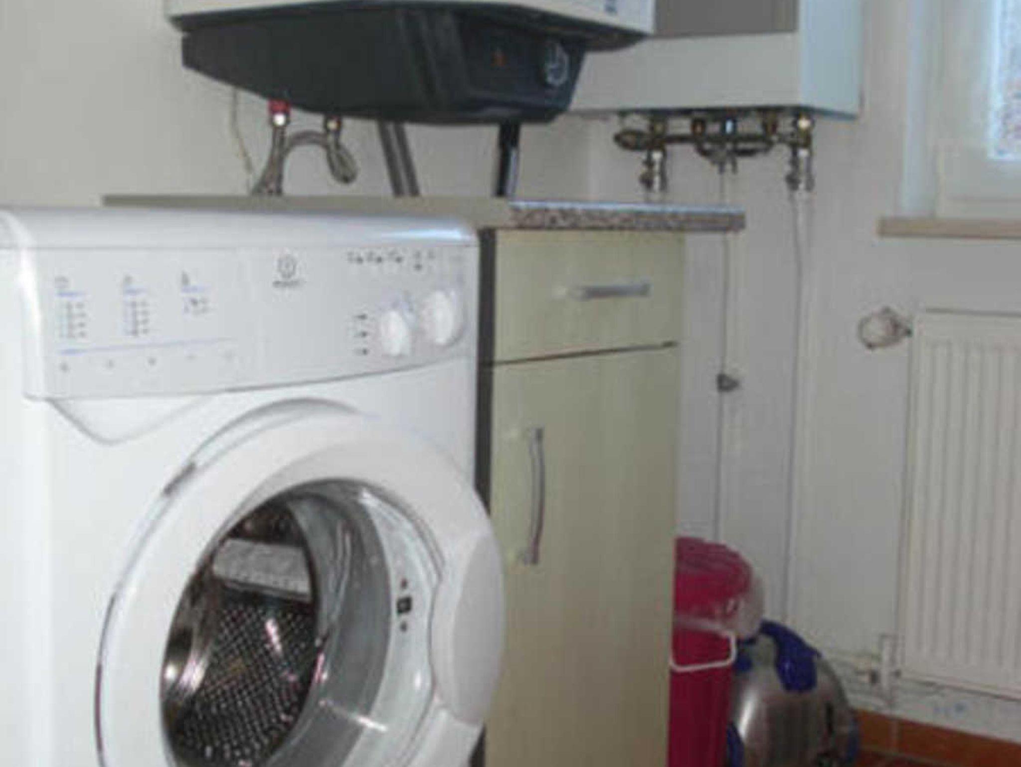 In dem kleinen Hauswirtschaftsraum gibt es eine Waschmaschine.