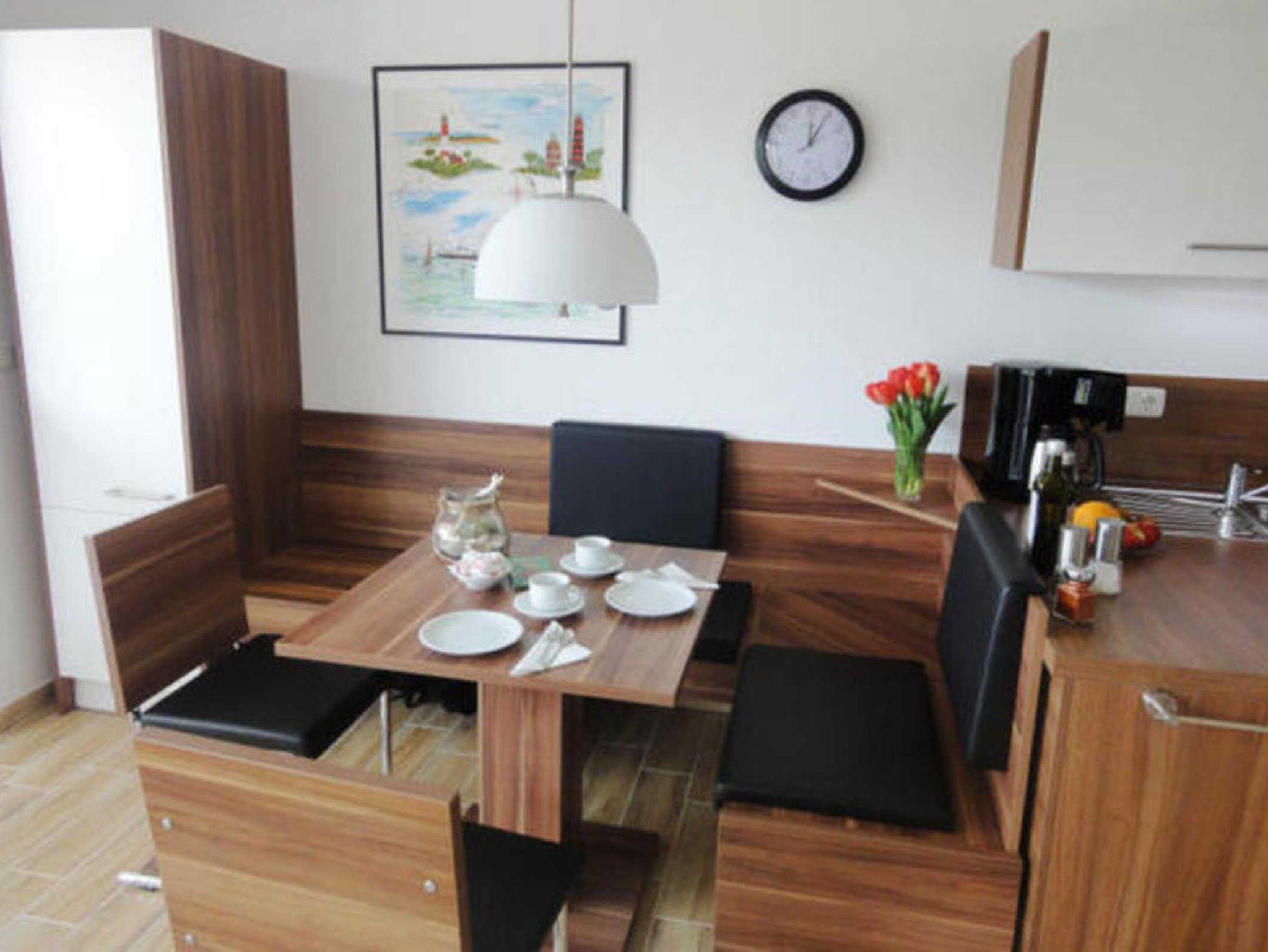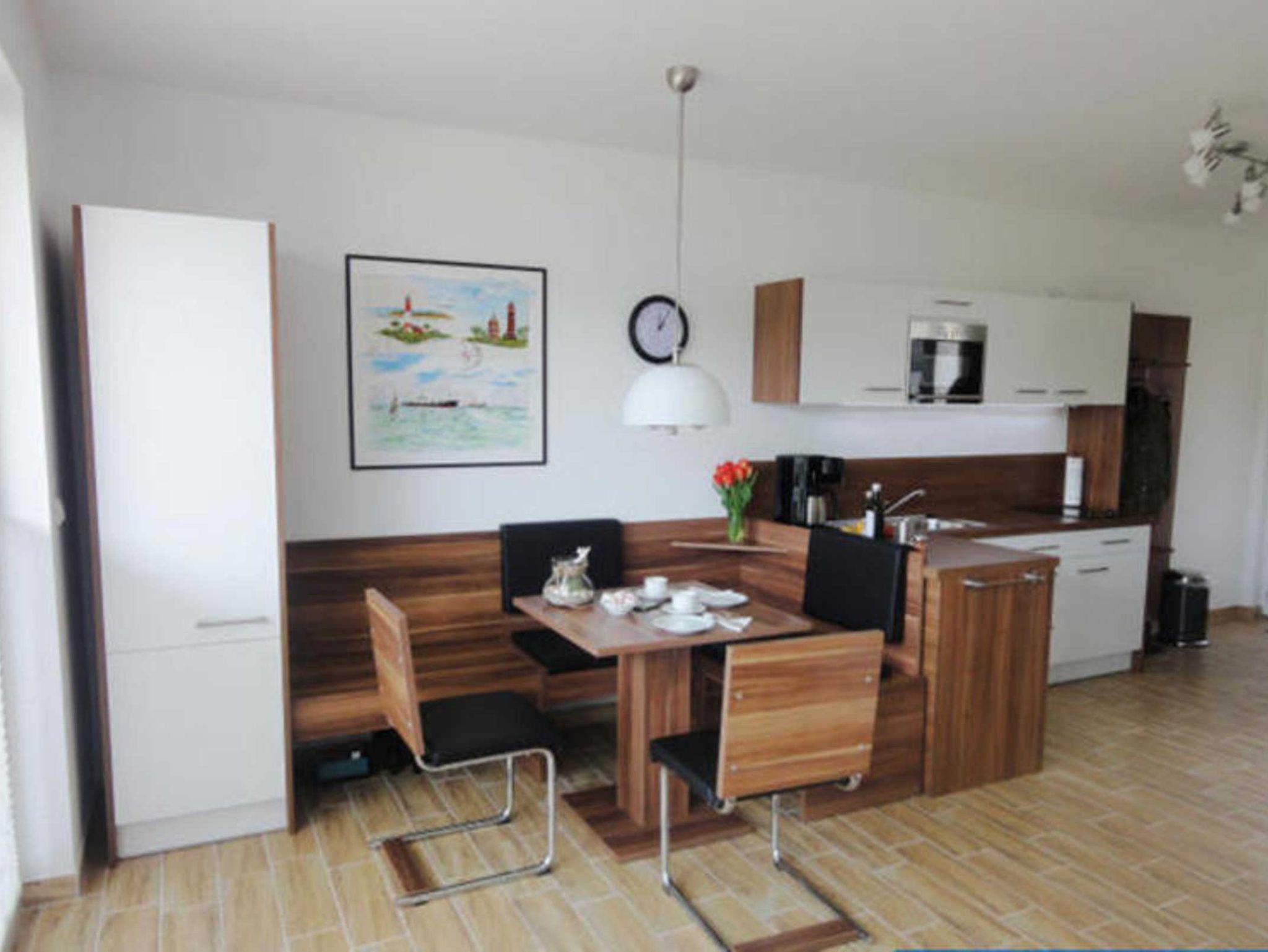 Die in das Wohnzimmer integrierte Küche ist u.a. mit einem Kühlschrank, einem Cerankochfeld, einer Mikrowelle, einem Wasserkocher und einer Kaffeemaschine sowie einem Esstisch mit Essbank und 2 Stühlen ausgestattet.