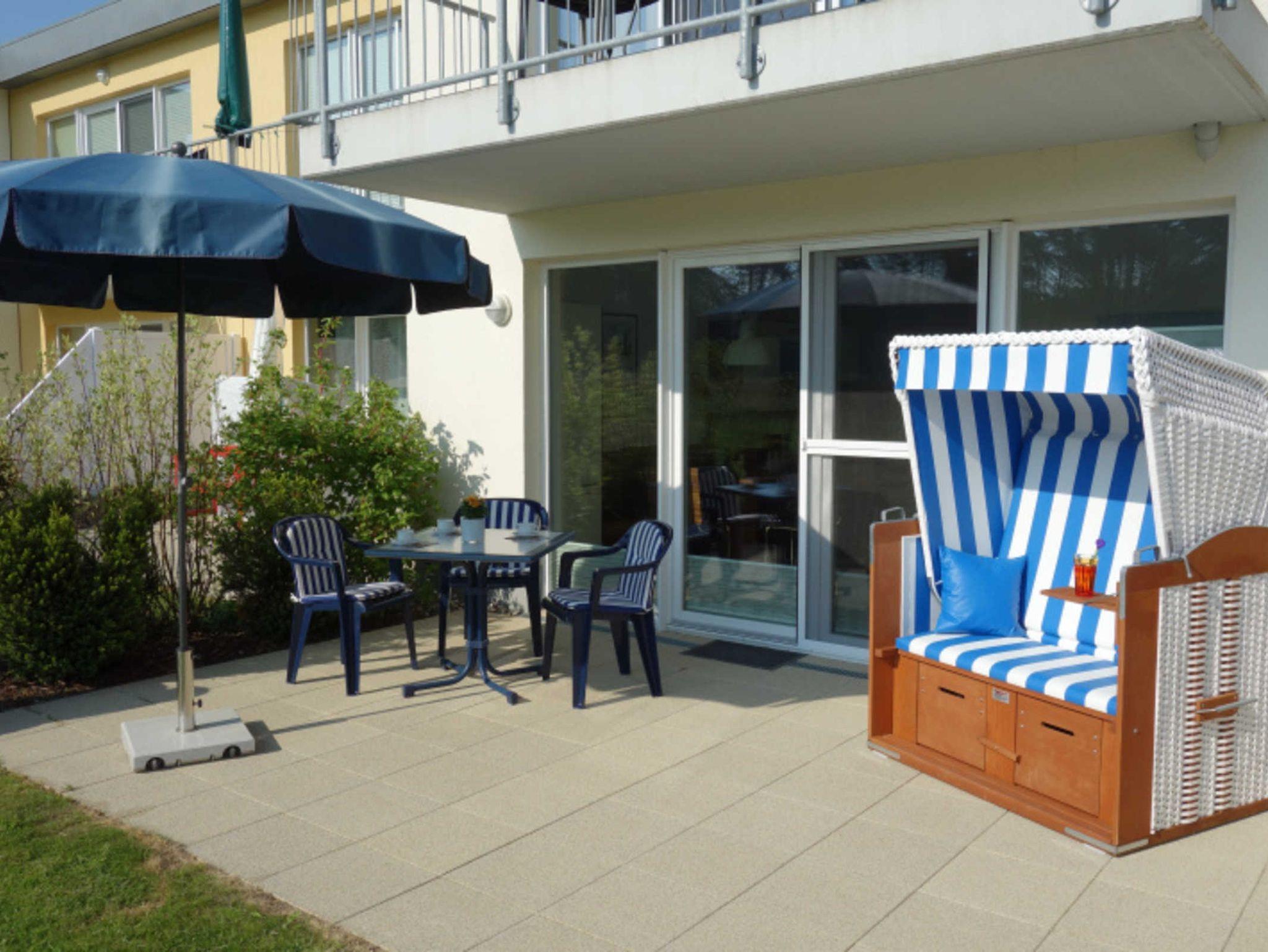 Zu der Ferienwohnung gehören eine große Terrasse mit Gartenmöbeln (u.a. ein Strandkorb) und eine anschließende Grünfläche.