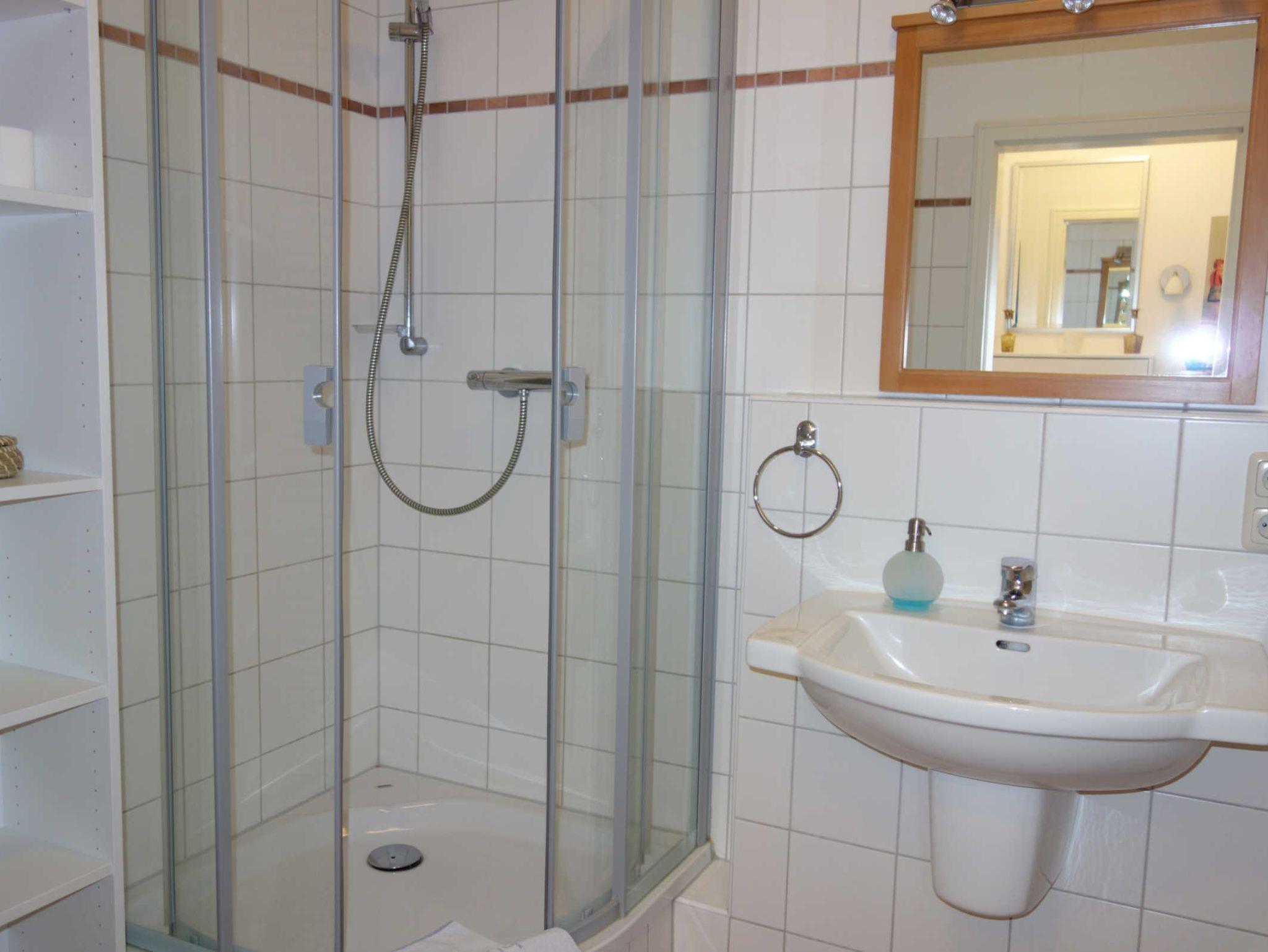 Das Bad hat eine Dusche, eine Waschmaschine und ein WC.