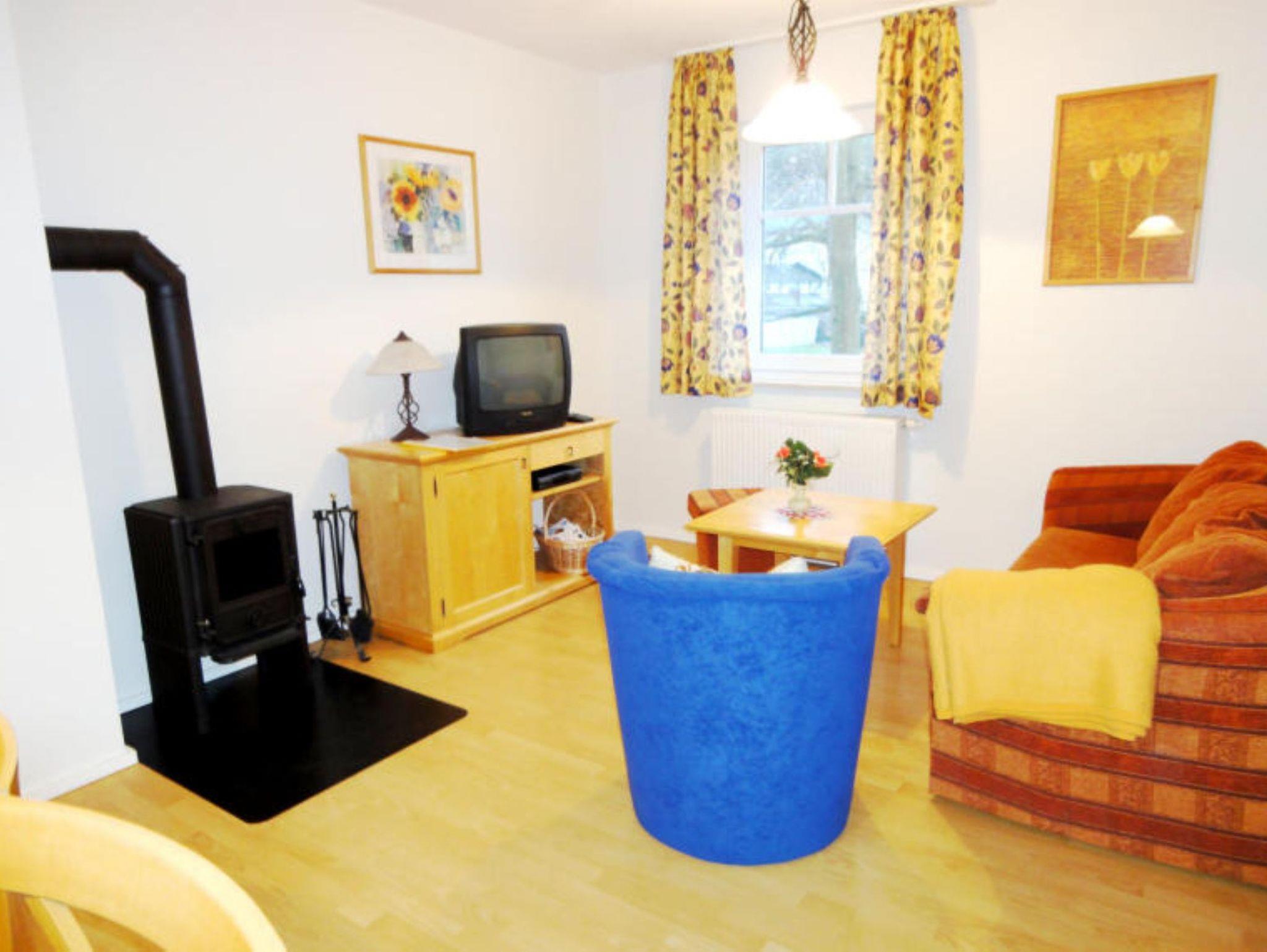 Das Wohnzimmer ist mit einem kleinen Kamin, einer Schlafcouch und einem Radio und Fernseher ausgestattet.