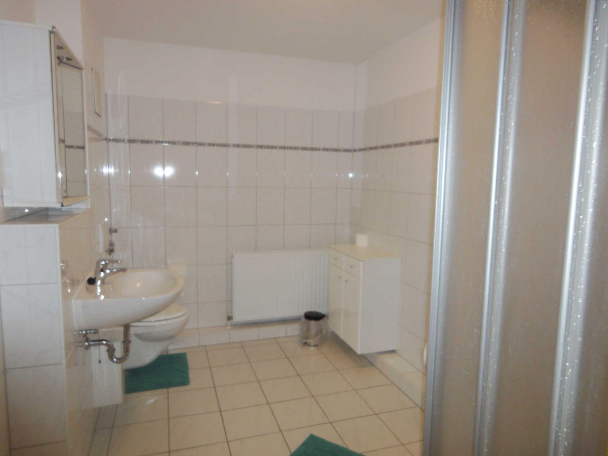 Das geflieste Bad ist mit einer Dusche, einem Waschtisch und einem WC ausgestattet.