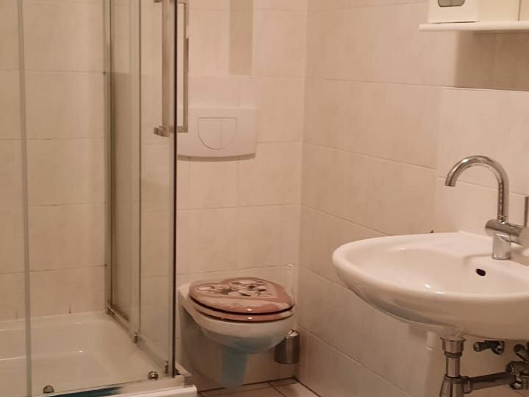 Eckdusche, Waschbecken, Toilette, Spiegelschrank, Schrank, Staubsauger, Wischeimer