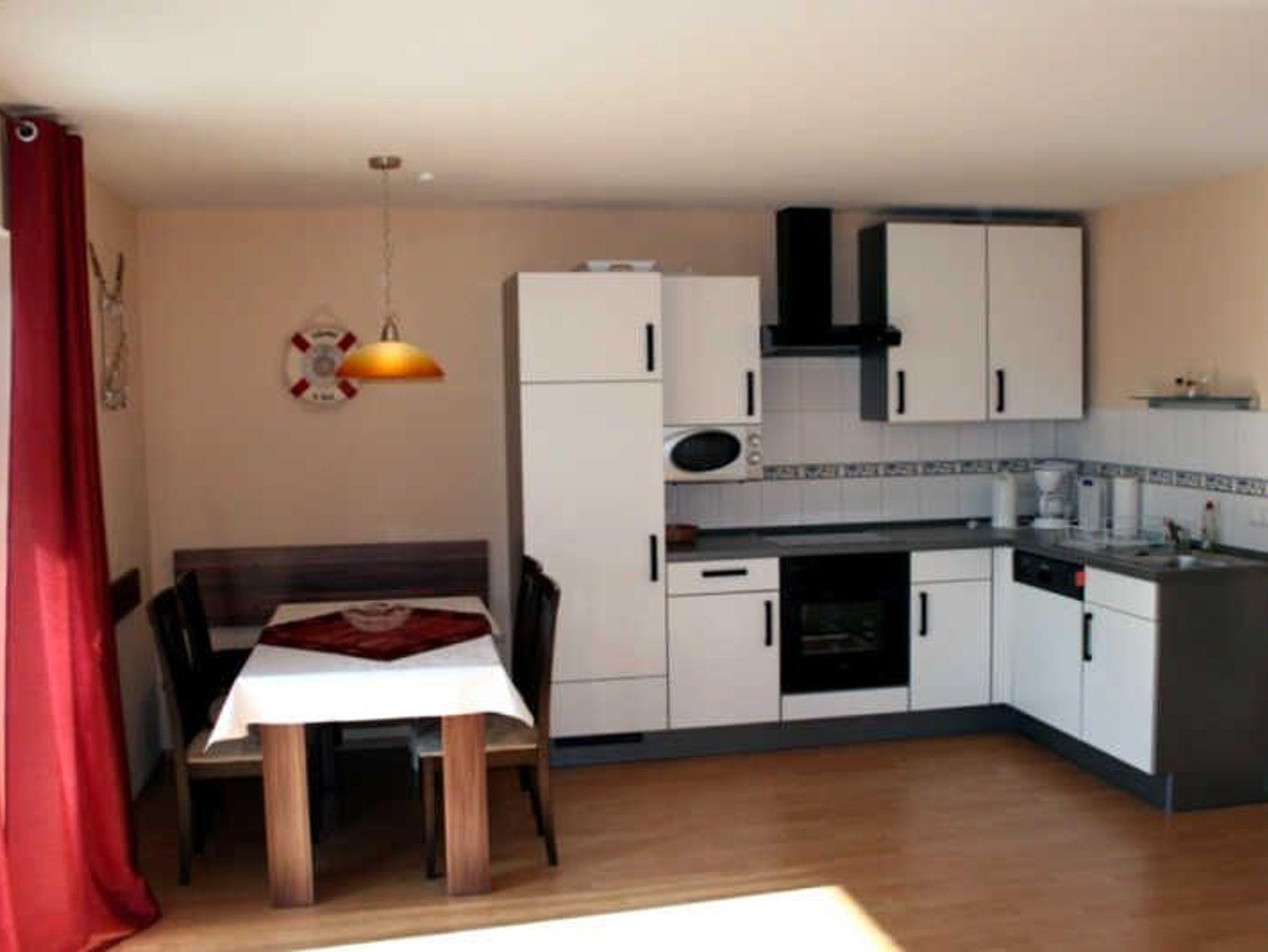 Die offene Küche mit Essecke ist in das Wohnzimmer integriert und ist unter anderem mit einem Backofen, einem Ceranfeld (4 Kochfelder), einem Kühlschrank mit Gefrierfach, einer Geschirrspülmaschine und einer Mikrowelle ausgestattet.