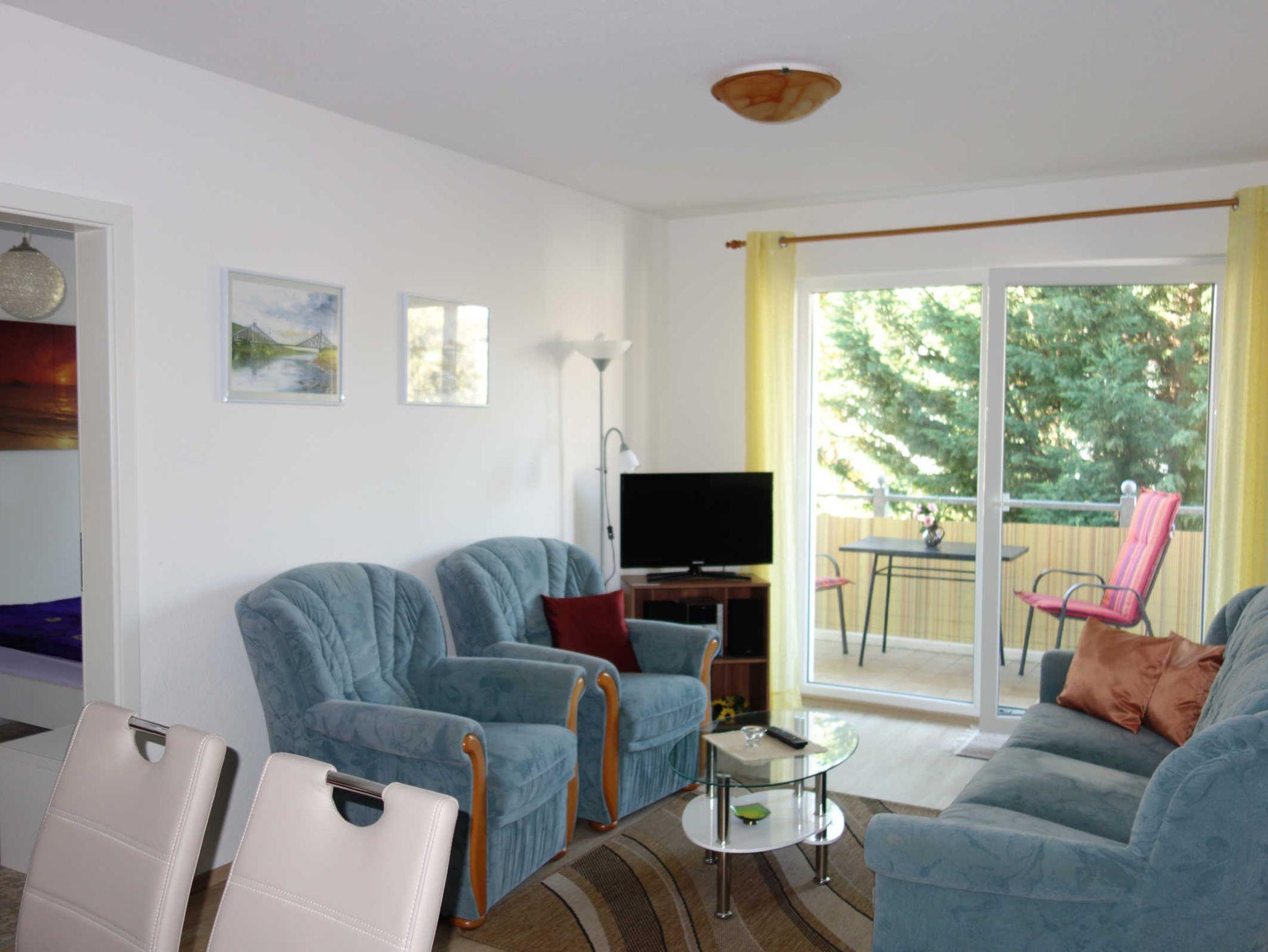 Im Wohnzimmer stehen eine Couch, 2 Sessel sowie ein Flachbildfernseher und ein Radio mit CD-Player.