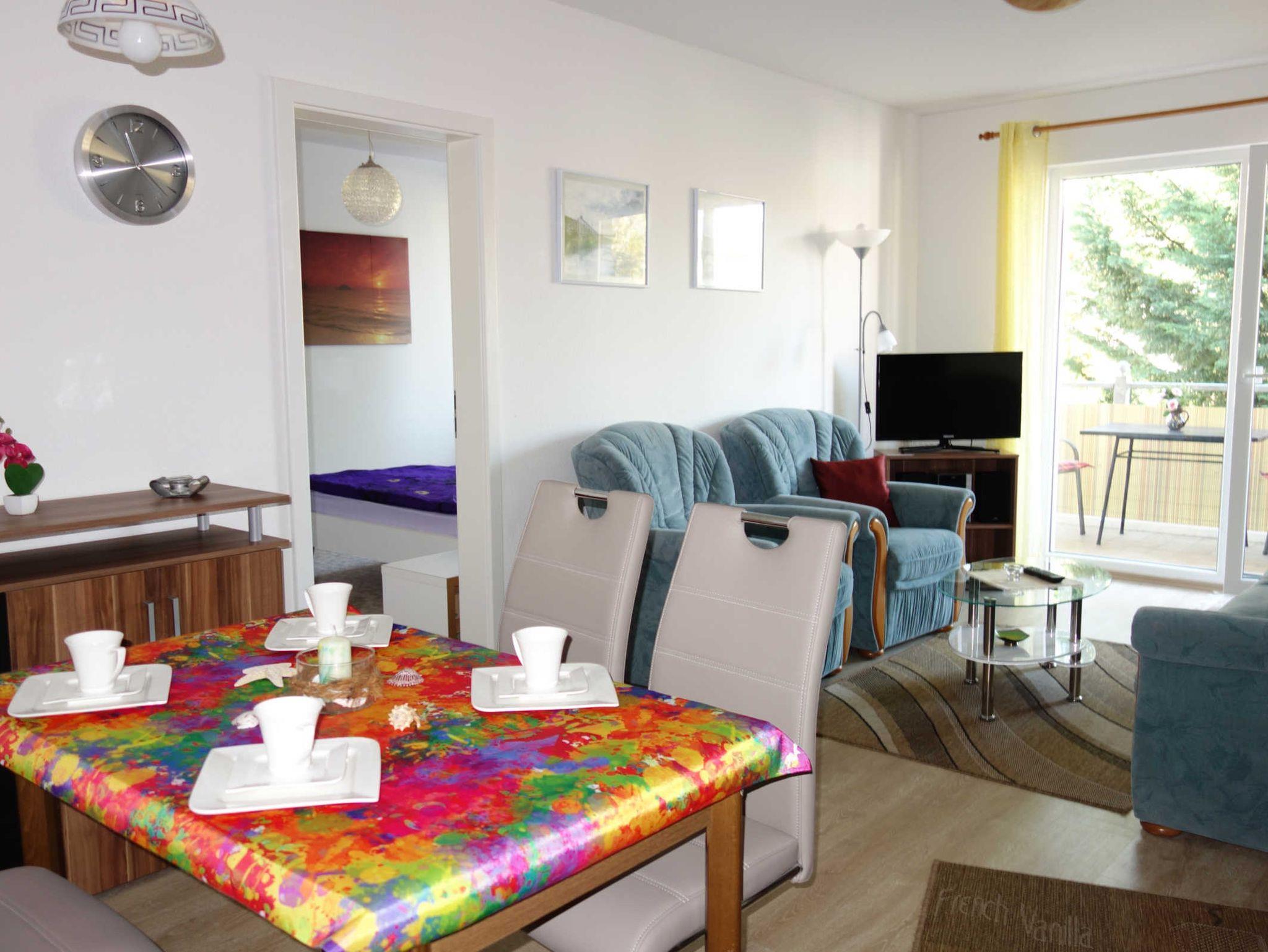 Die 2 Zimmer Ferienwohnung befindet sich im 1.Obergeschoss im Haus Seestern in der Friedensstraße. In der Ferienwohnung gibt es ein Wohnzimmer mit einer Couch und einen Fernseher, eine offene Küche mit einem Backofen, einem Geschirrspüler und einem Kühlschrank, zwei Schlafzimmer (eines mit einem Doppelbett und eines mit einem Etagenbett) sowie ein Bad mit Dusche und WC.