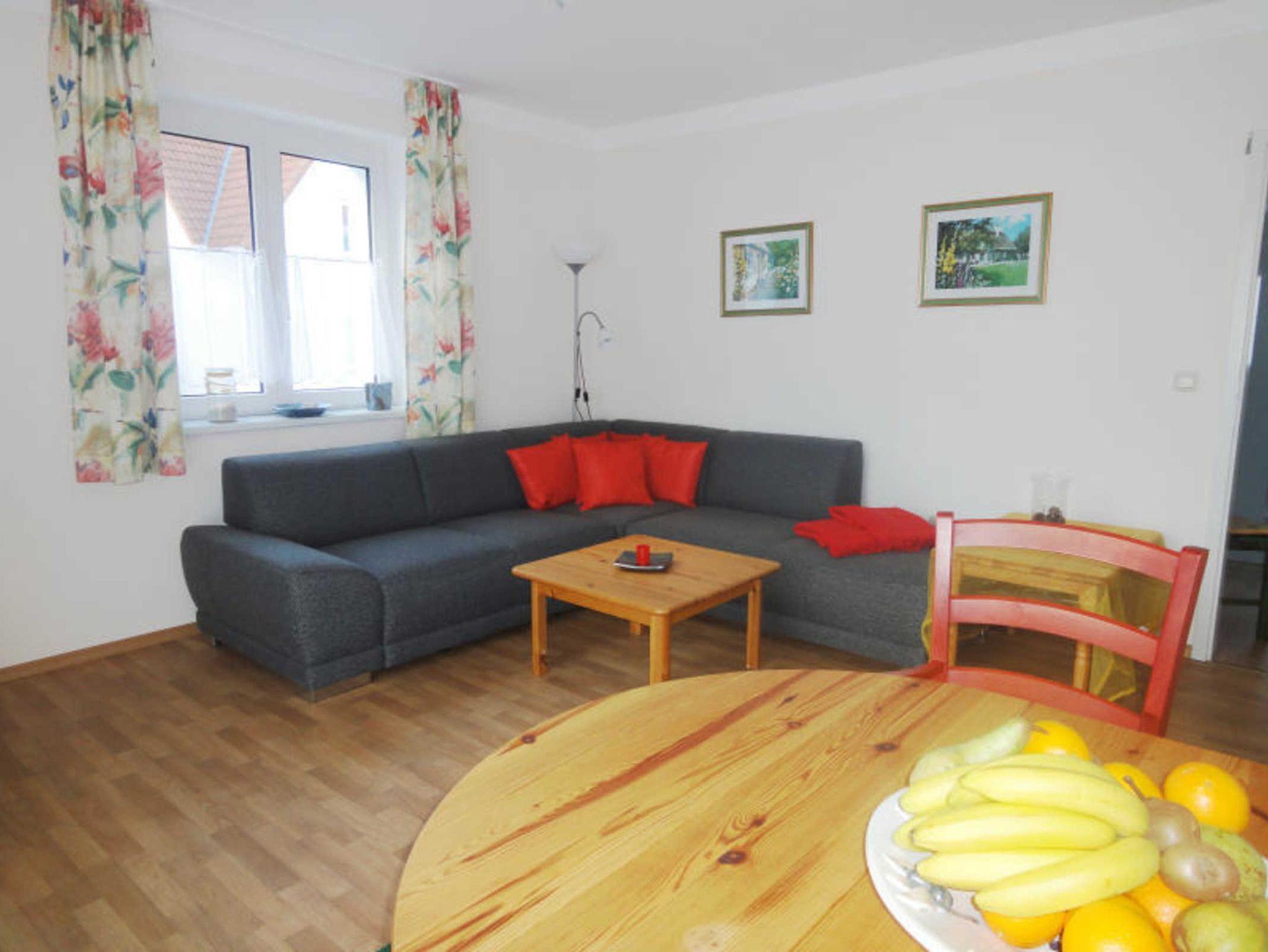 Das Wohnzimmer ist mit einer Schlafcouch, einer Essecke mit einem Tisch und 4 Stühlen sowie einem Radio und einem Fernseher ausgestattet.