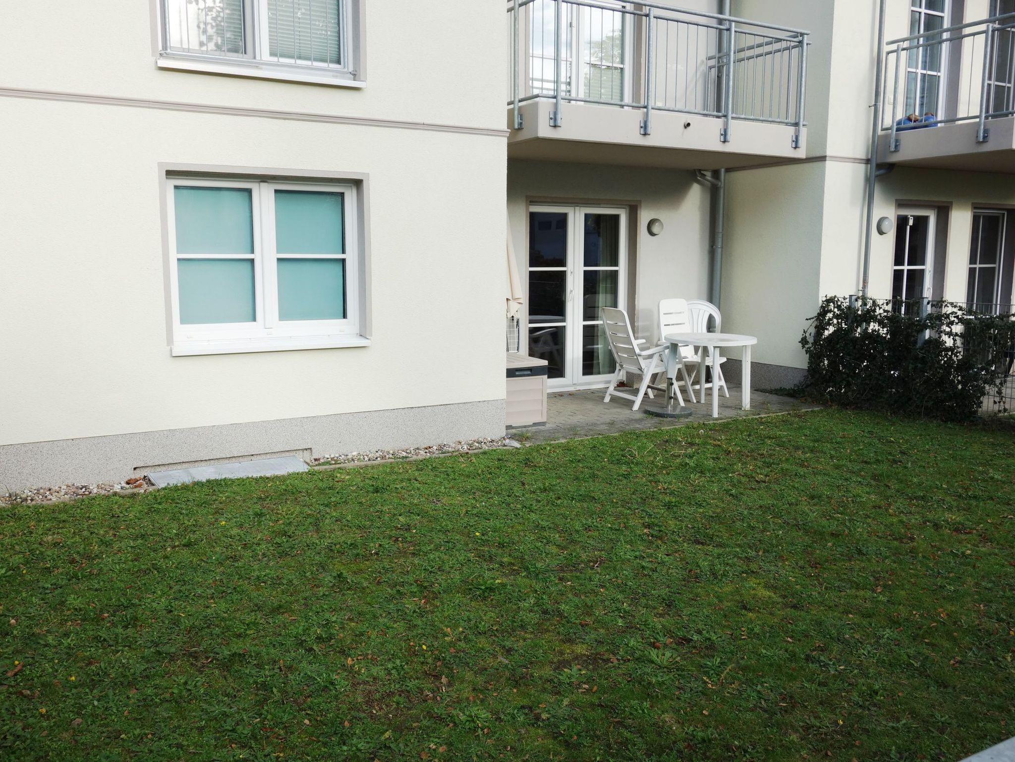 Zur Wohnung gehören außerdem ein kleiner, abgeschlossener Garten mit einer Terrasse (Süd-Seite) und ein PKW-Stellplatz.