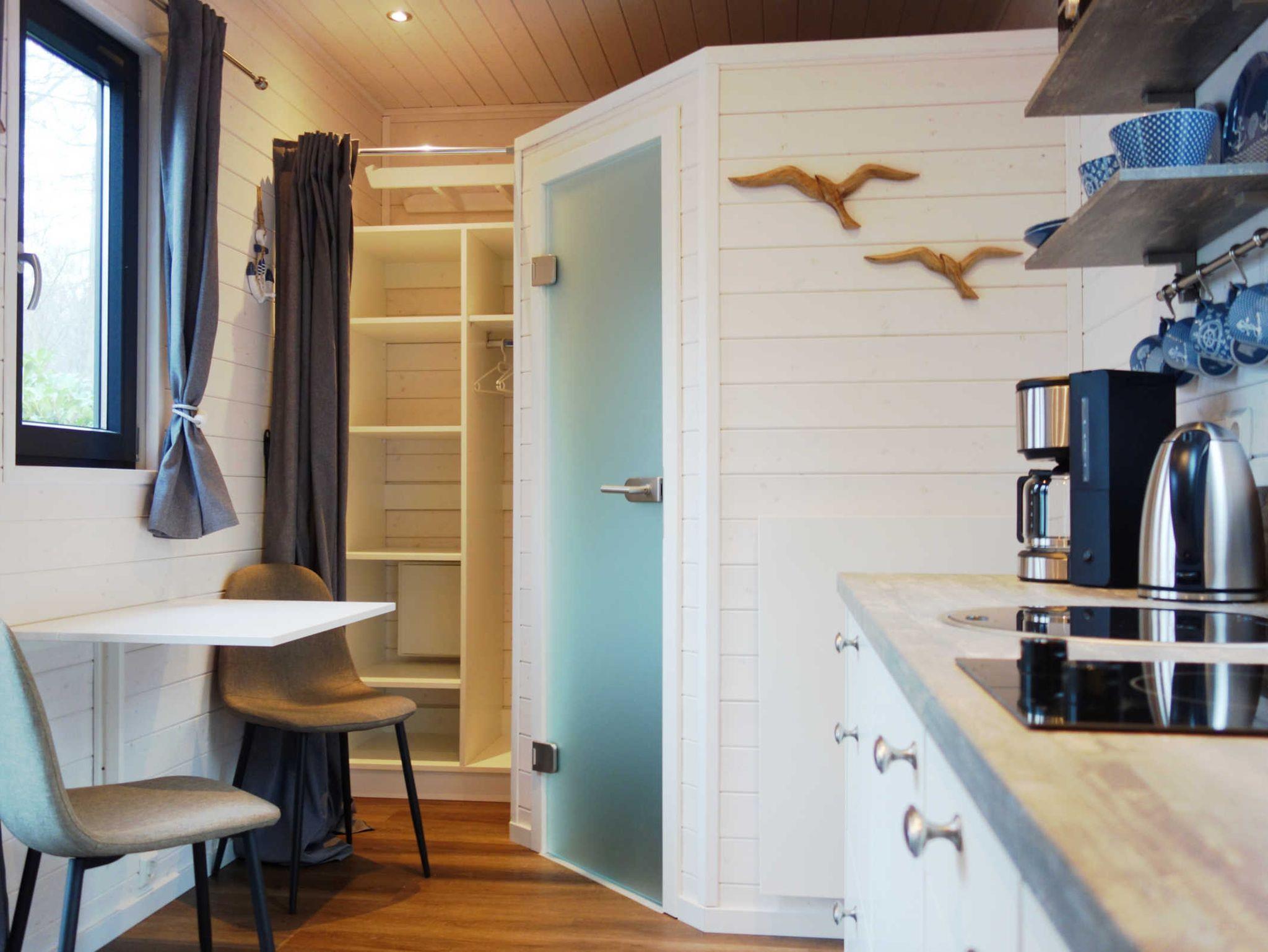 Das erste Tiny House in Graal-Müritz steht auf dem Ostseecamp. Das ca. 18 qm große Häuschen auf Rädern verfügt über eine Küchenzeile mit einem Cerankochfeld (2 Kochfelder), einem Kühlschrank, einer Spüle, einem Wasserkocher und einer Kaffeemaschine.
