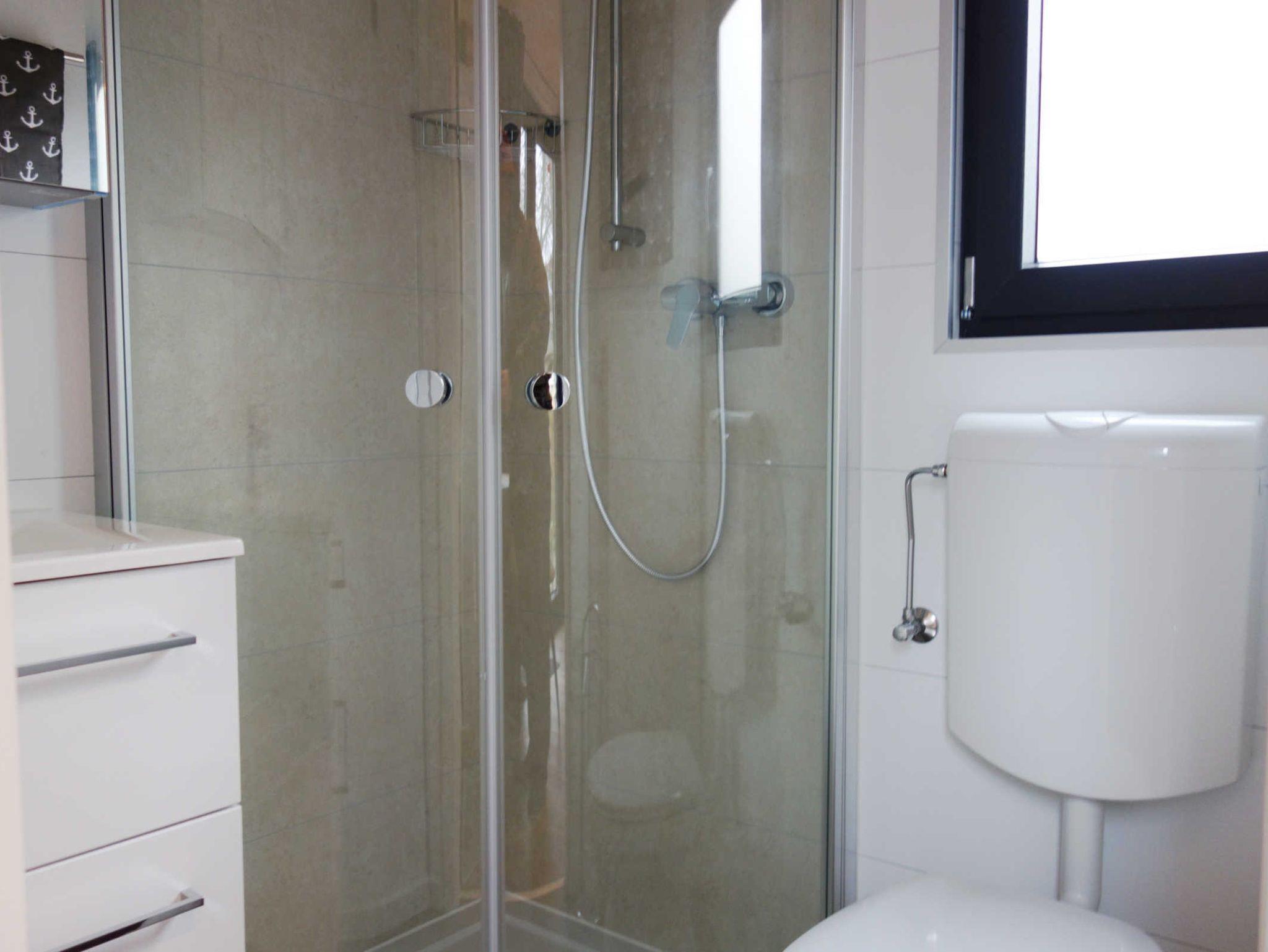 Ein kleines Bad mit einer Dusche, einem Waschtisch und einem WC sowie einem Fenster ist in dem Tiny House integriert.