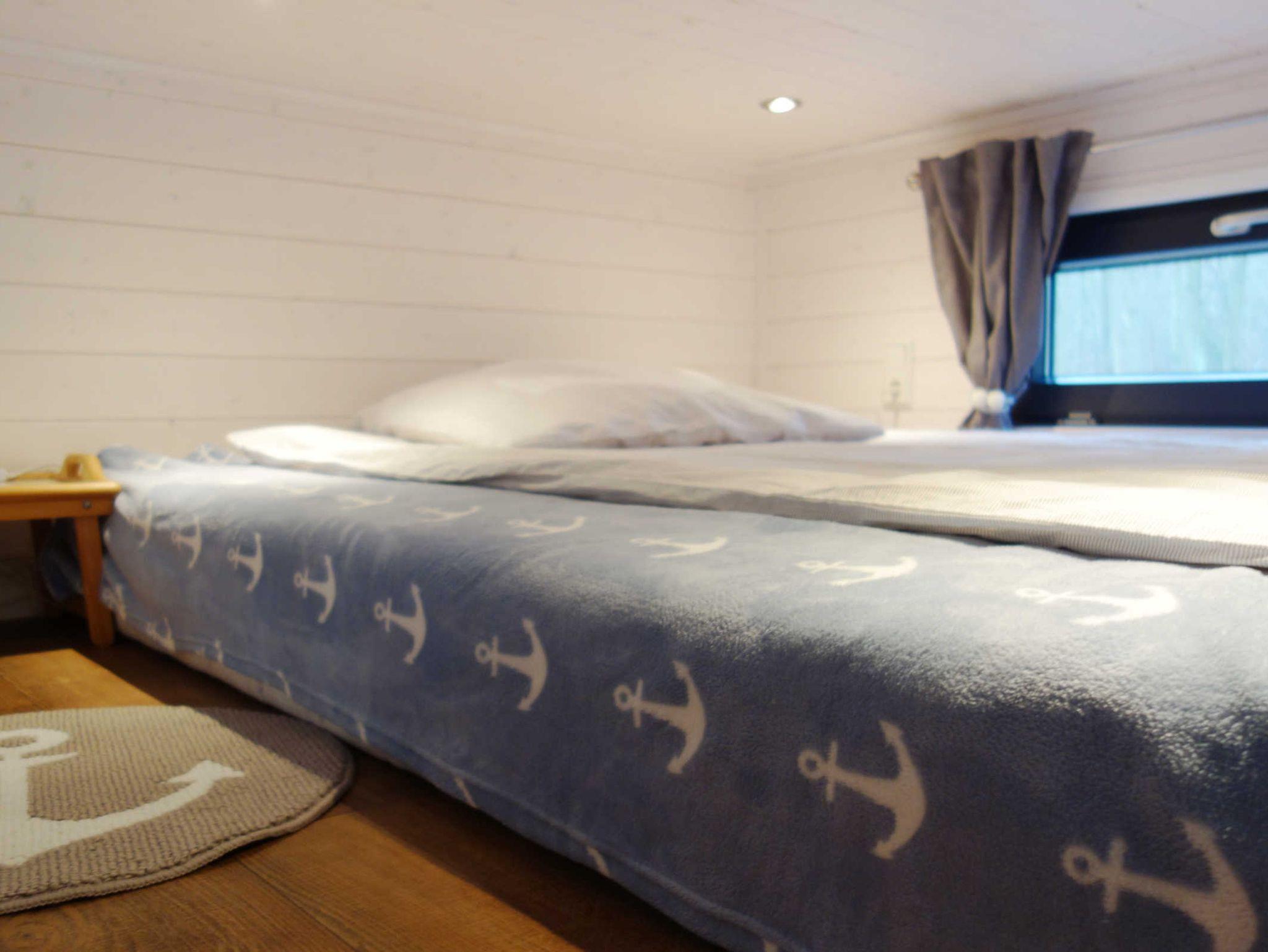 Darüber auf der Empore befindet sich der offene Schlafbereich mit kleinem Fenster. Der Schlafbereich ist über eine Leiter zu erreichen.