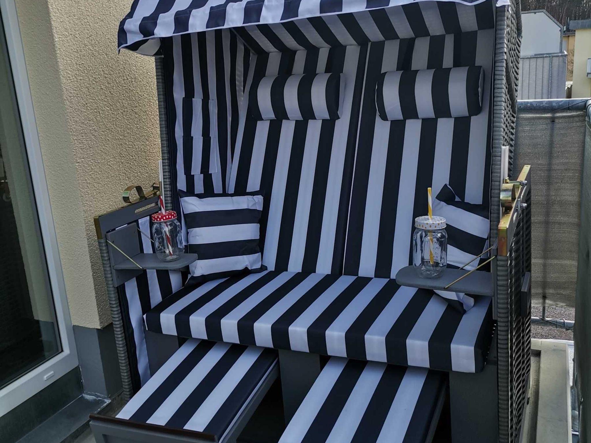 Strandkorb und einer Markise für den ganzen Balkon ausgestattet, dass Sie den Balkon genießen