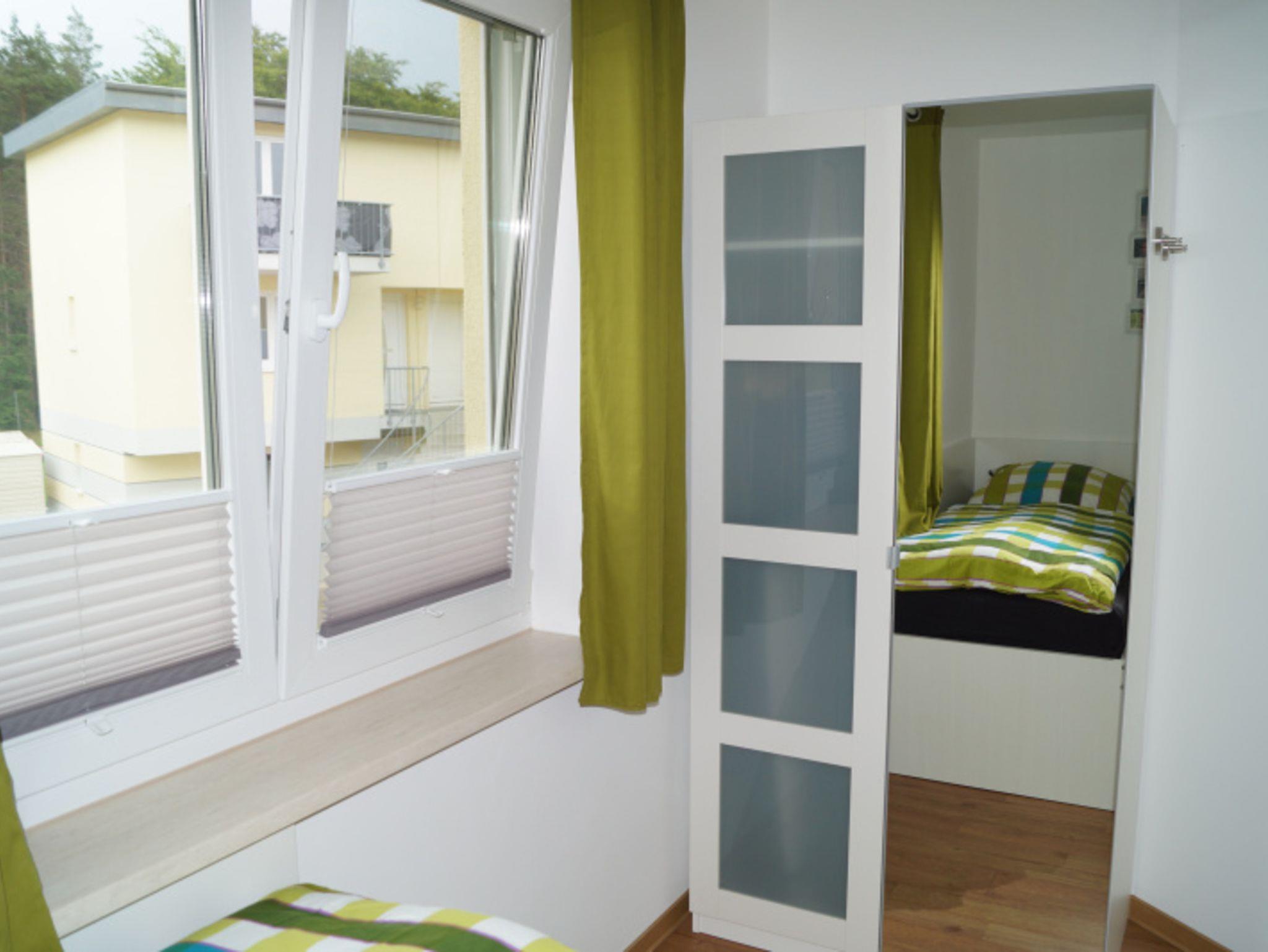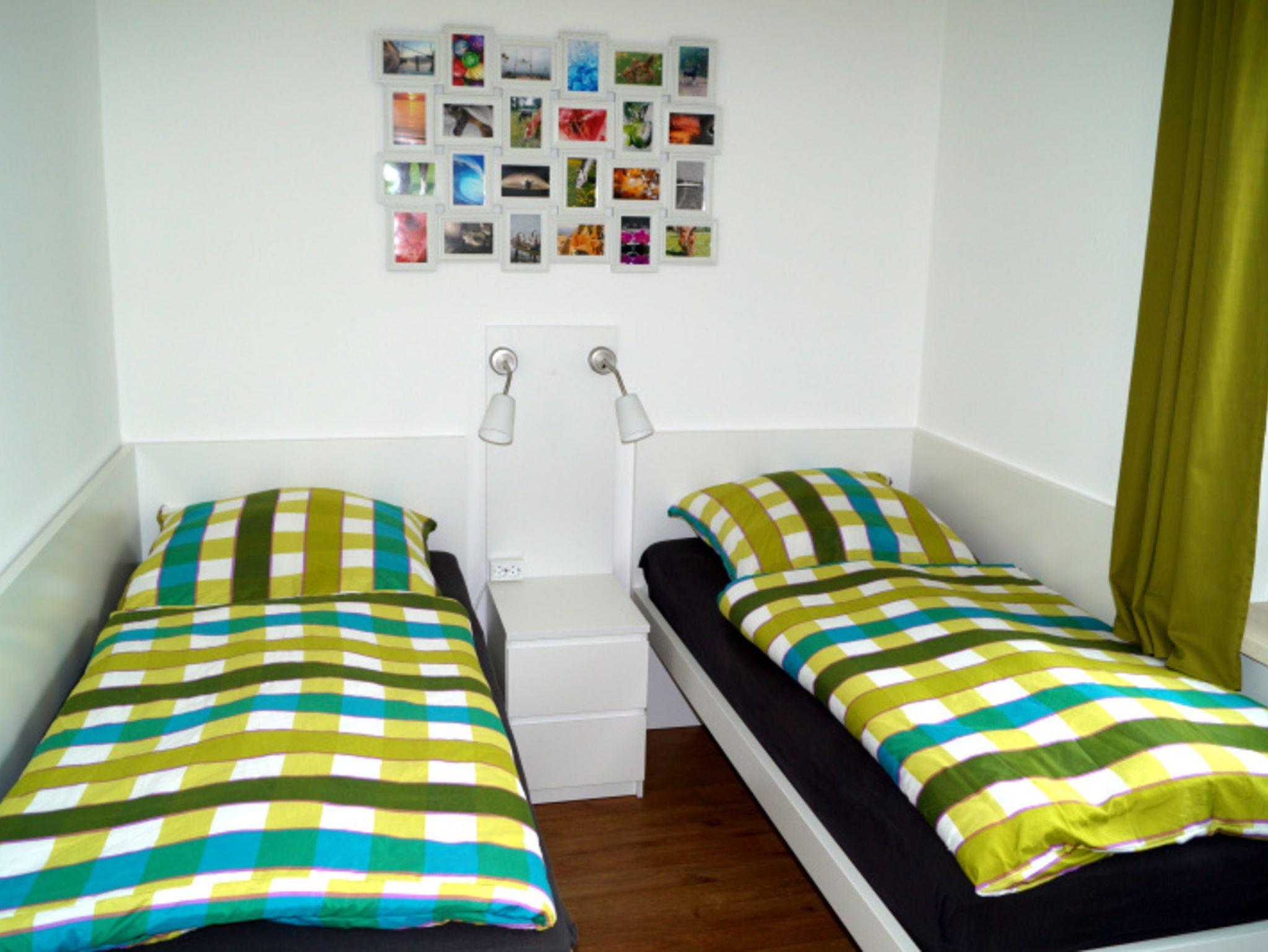 Das Schlafzimmer verfügt über ein Doppelbett und einen Kleiderschrank. In einem weiteren Zimmer stehen 2 Einzelbetten und ein Kleiderschrank.