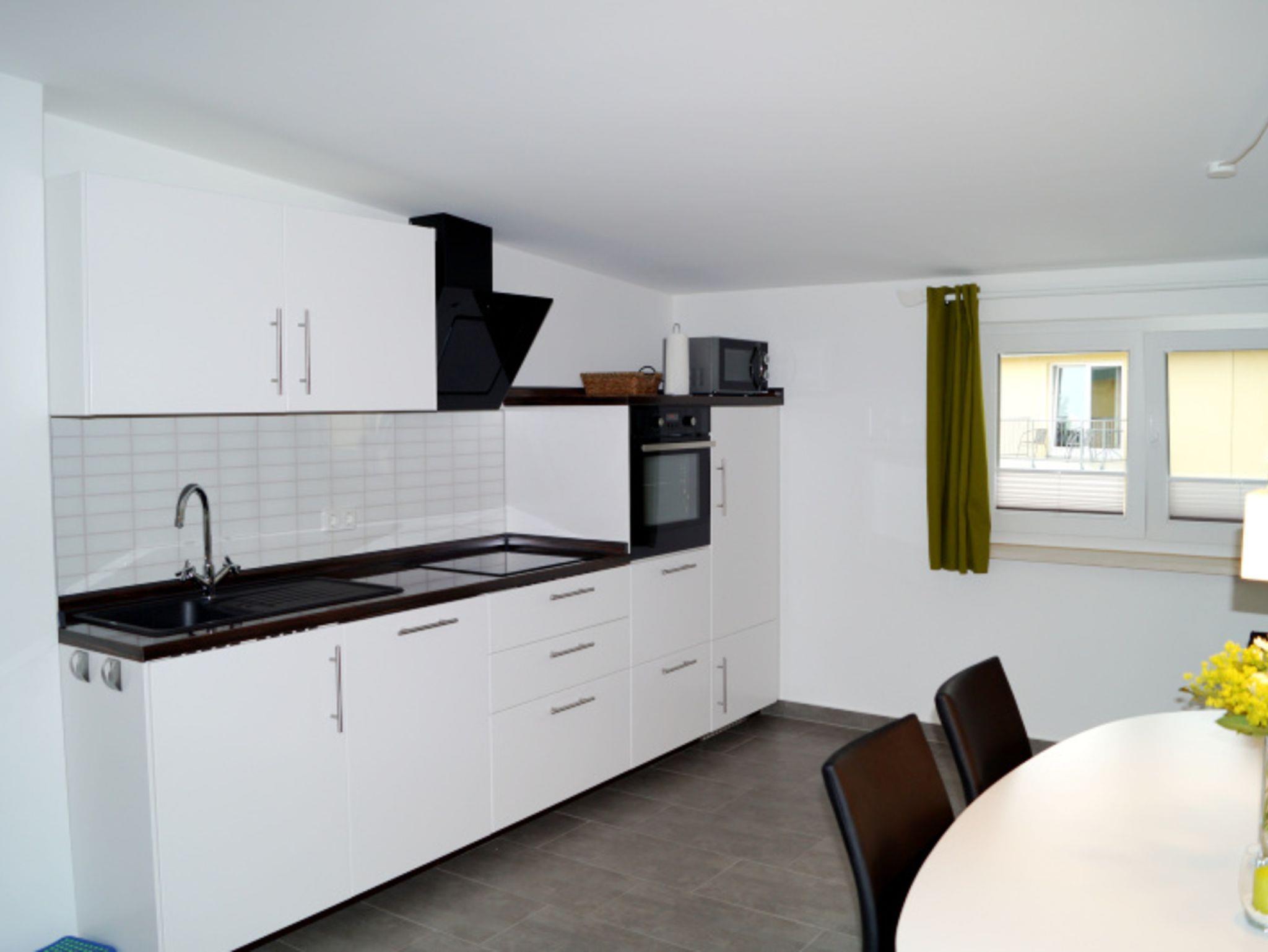 Die offene Küche mit großem Esstisch und sechs Stühlen ist in das Wohnzimmer integriert und verfügt unter anderem über einen Backofen, 4 Ceranfelder, einen Geschirrspüler, einen Kühlschrank, eine Mikrowelle, eine Kaffeemaschine und einen Wasserkocher.