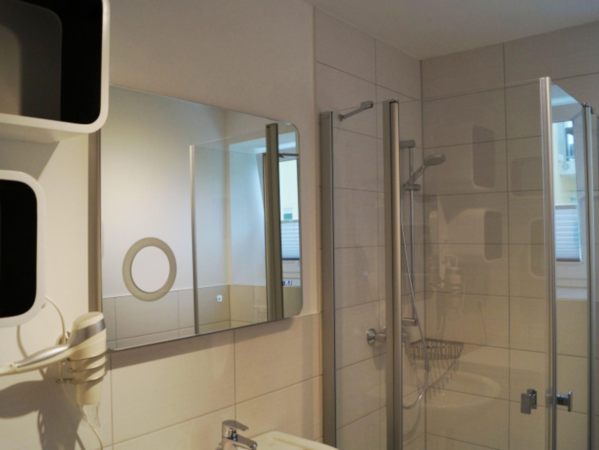 Im gefliesten Bad mit Fenster befinden sich die Dusche, das WC und eine Waschmaschine. Ein Bügelbrett und ein Bügeleisen befinden sich im Abstellraum.