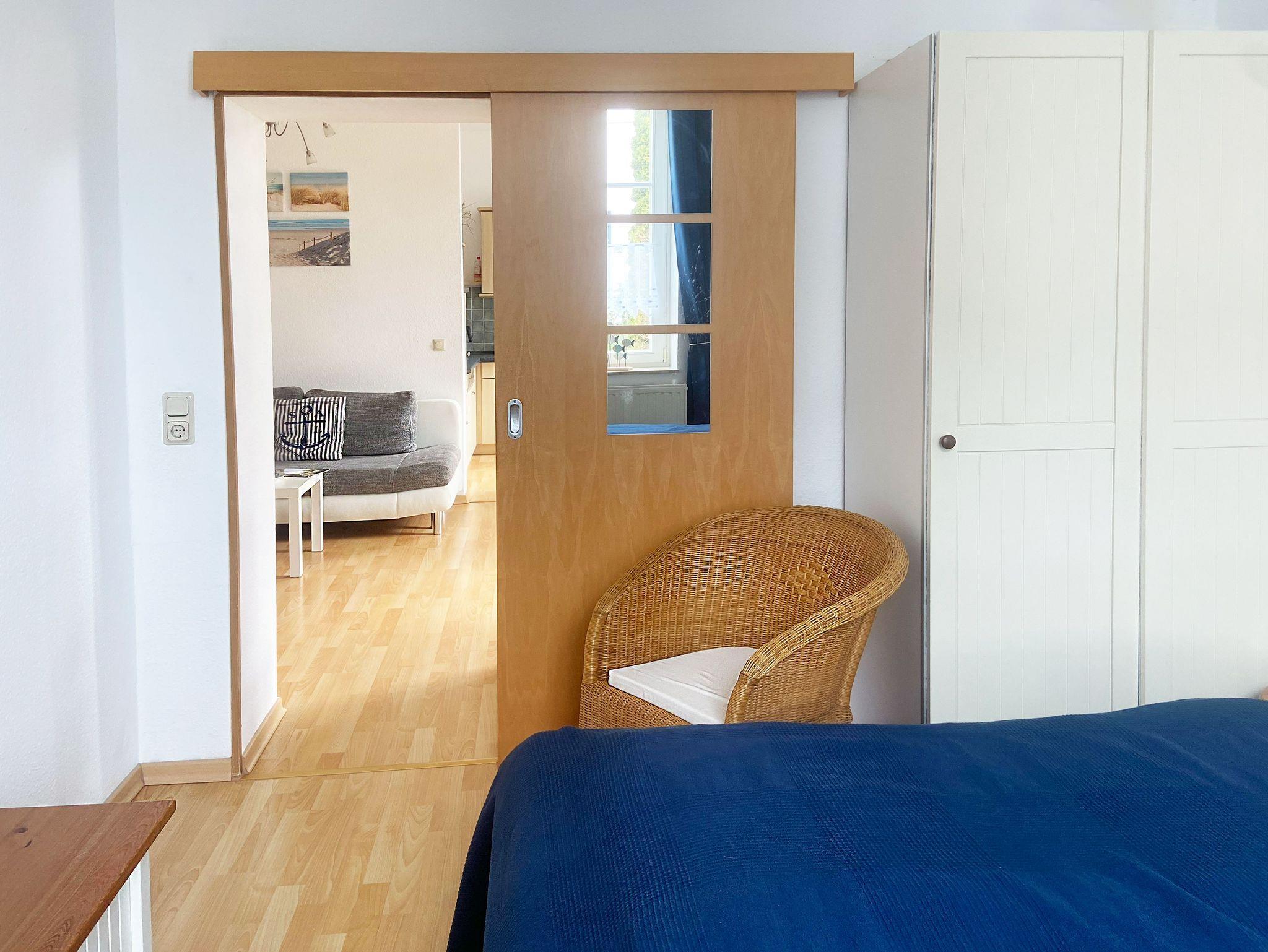 Im Schlafzimmer befindet sich ein Doppelbett mit zwei Matratzen (je 80 cm x 200 cm), die als hart empfunden werden.