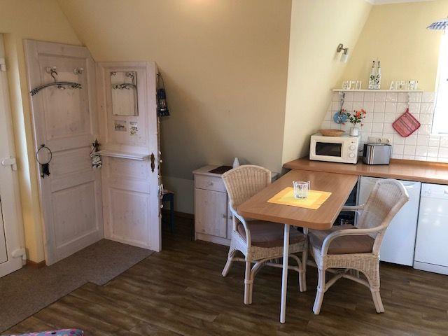 Eigener Zugang. Wohnzimmer mit Küchenzeile, Spülmaschine und Mikrowelle.