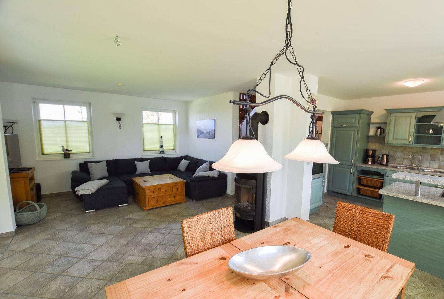 Das Wohnzimmer ist mit kompl. Küchenzeile mit Microwelle, Kaminofen, 2 Schlafzimmer mit Boxspringbetten + TV a 1,80 x 2,00 m, 2 Bäder, Dusche /WC, Badewanne / WC / Bidet
