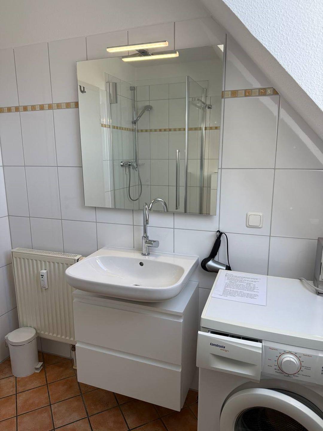 Das Badezimmer ist mit Dusche/WC und einer Münzwaschmaschine ausgestattet. Die Dachfenster in der Kochnische und im Bad sind mit Sonnenschutzrollos versehen.