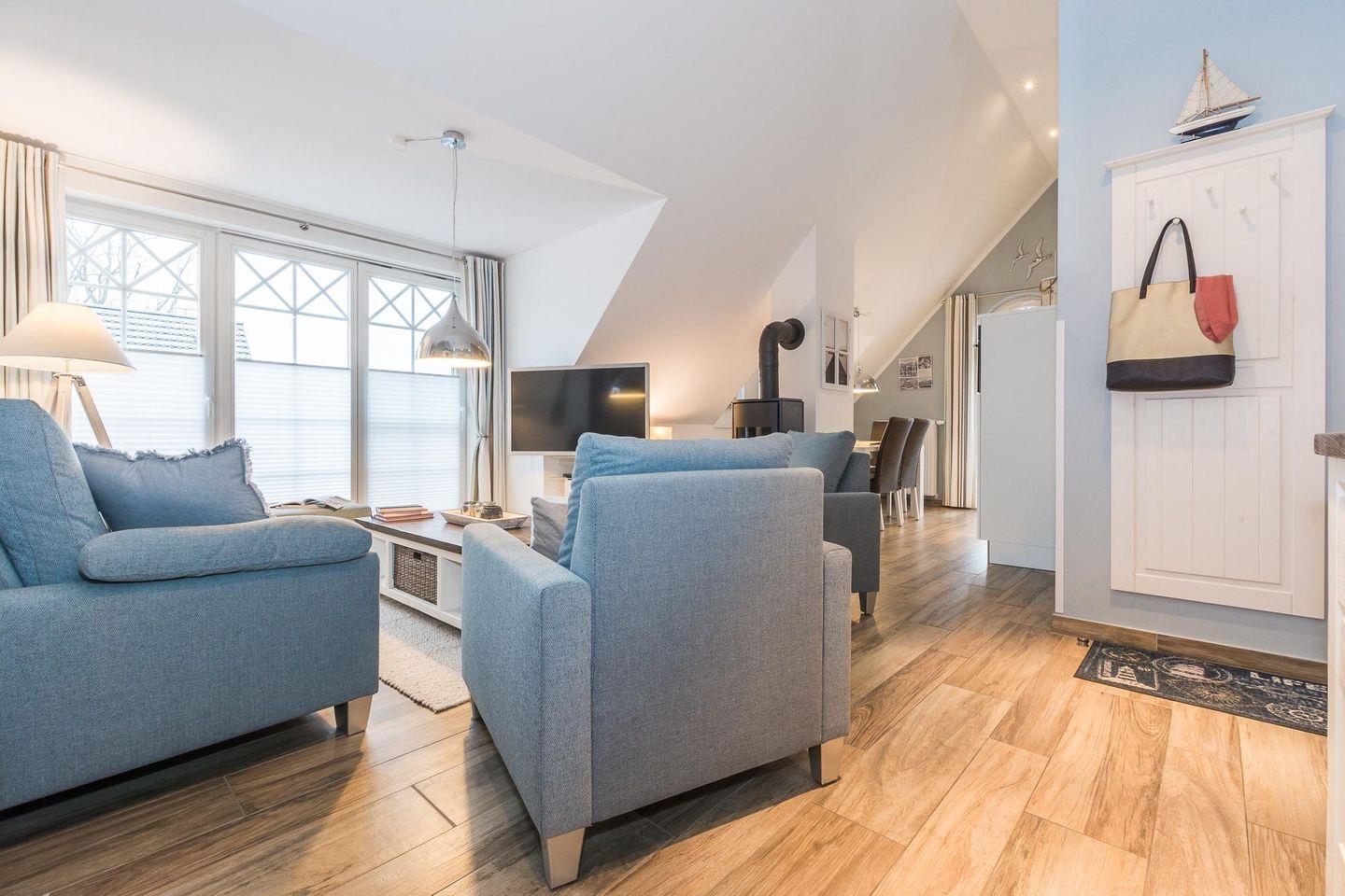 Die Ferienwohnung Ostseetraum ist eine hochwertig eingerichtete Wohnung für 2 - 4 Personen im Dachgeschoss des exklusiven Mehrfamilienhauses Adéle, das in darßtypischer Architektur erbaut wurde. Sie verfügt über rund 72 m² Wohnfläche und eine große Dachterrasse, die nach Süden ausgerichtet ist.