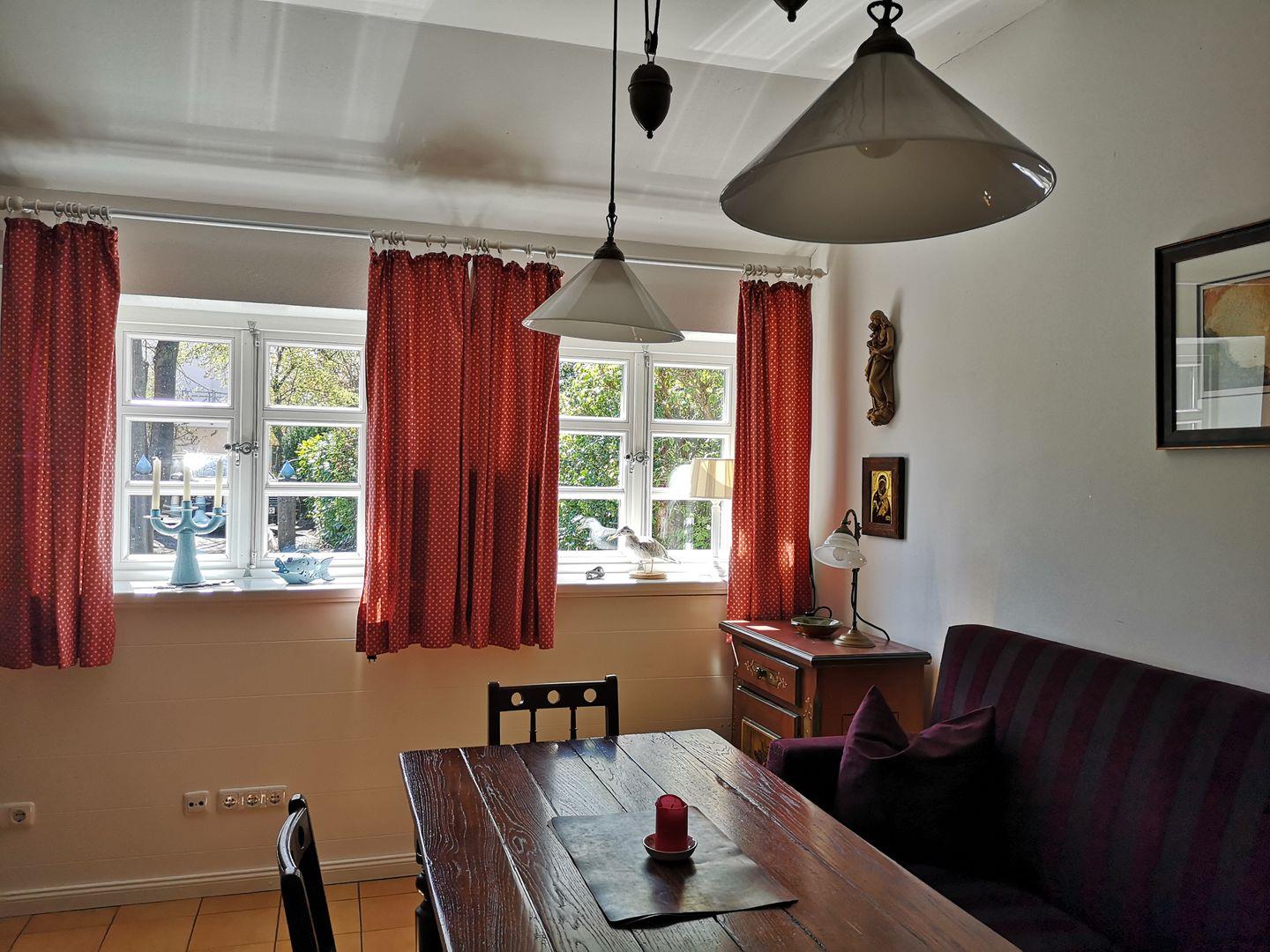 Im Erdgeschoß befinden sich ein offener Wohnbereich, Küche, Bad und WC. Ein antiker Esstisch aus Eiche erinnert an Ur-Großmutters-Zeiten, eine Wendeltreppe aus Holz führt in das Dachgeschoß, hier befindet sich das Doppelbett.