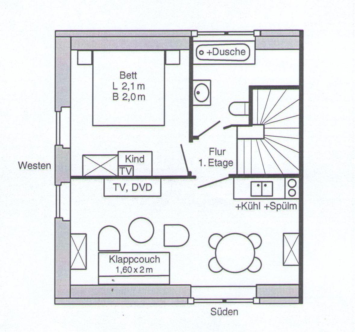 Private Ferienwohnung im 1.Stock, ca. 45 m² groß, für große Menschen geeignet (alle Türen 2.10m hoch), Wohnzimmer mit Miniküche (inkl. Mikrowelle, Geschirrspüler) + Schlafcouch als Aufbettung, TV, Schlafzimmer mit Westfenster und Ehebett (2,10m lang) +TV, Badewanne mit Dusche/WC,