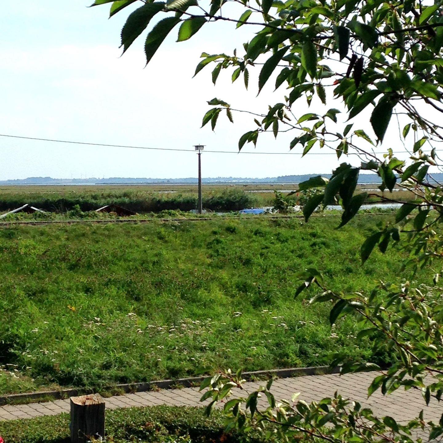 Zur Wohnung gehört ein sonniger Balkon direkt am Deich mit freiem Blick auf den Bodden und die Kranichinsel Kirr.