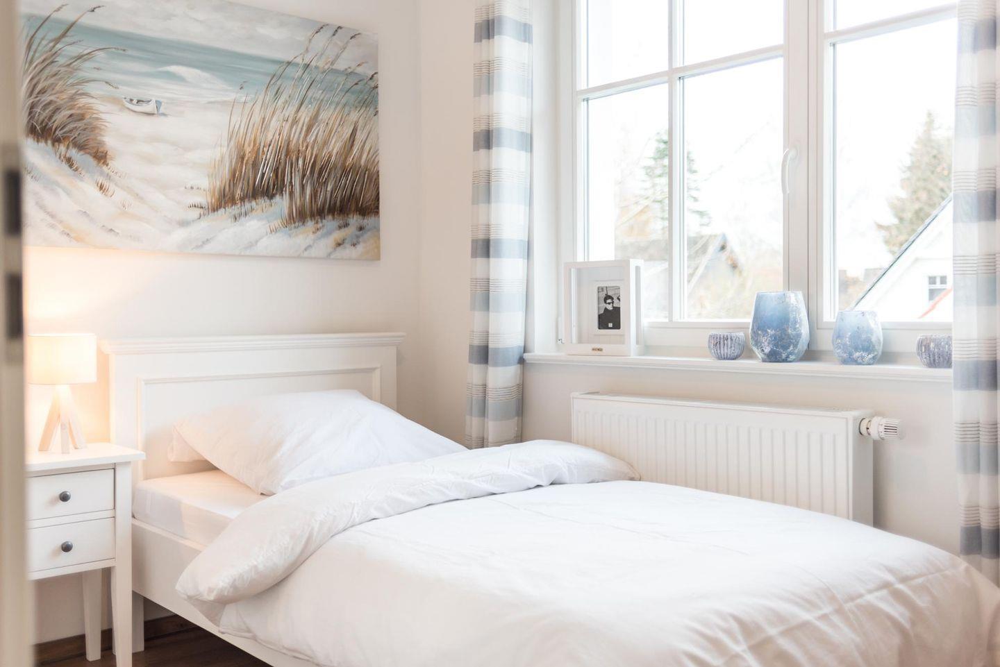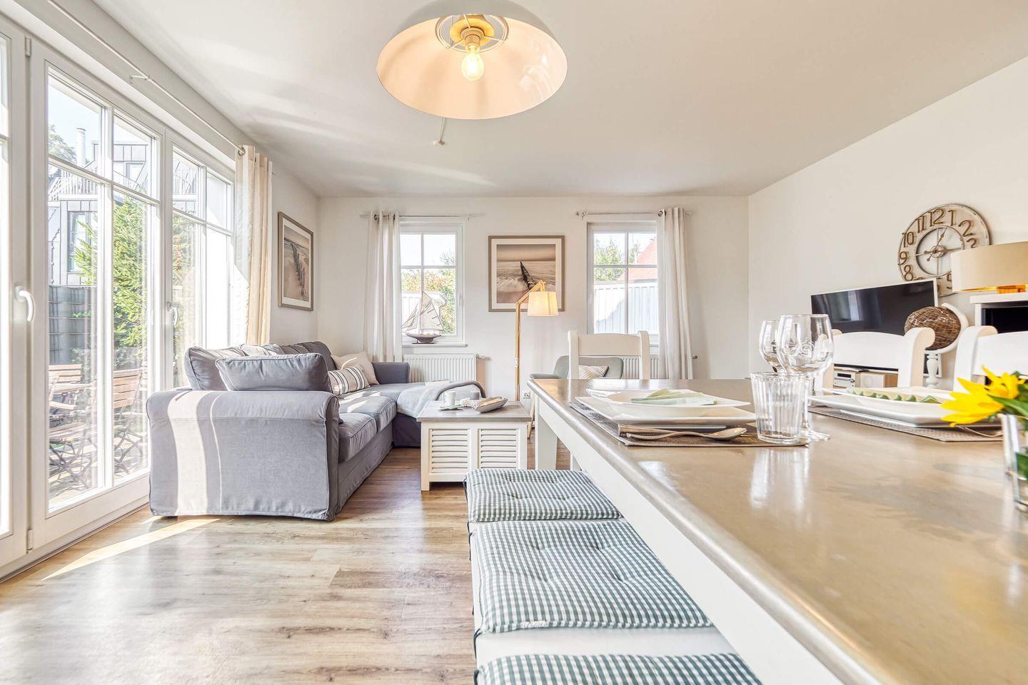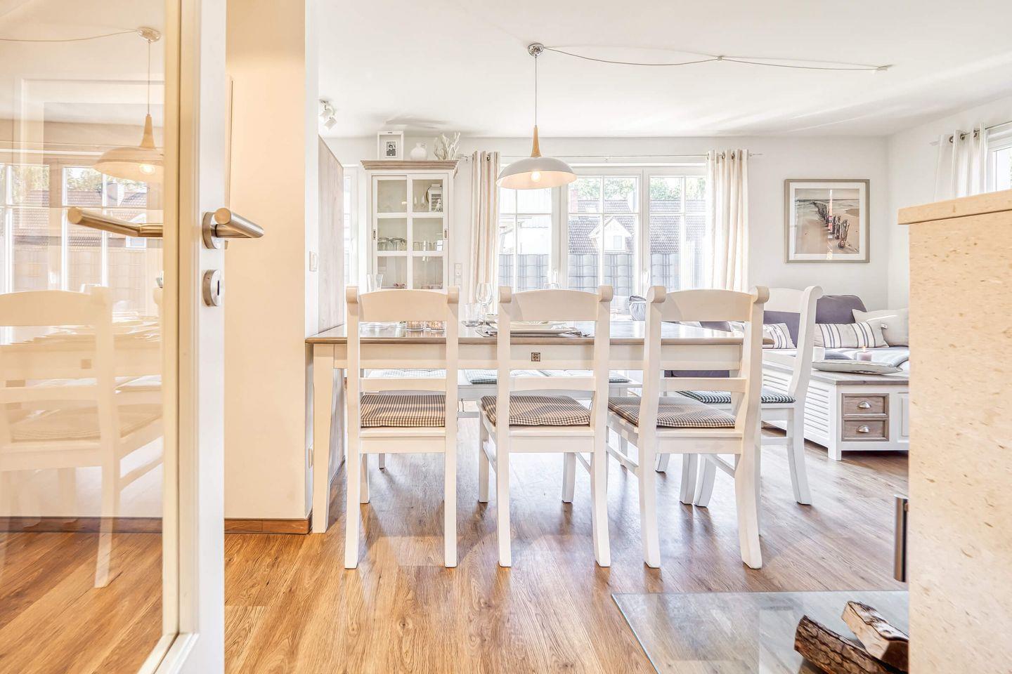Die komfortable Haushälfte ist zentral & ruhig gelegen, ca. 700m zum Strand, 800 m zum Bodden und eignet sich für 7 Personen. Ein großzügiger Wohnraum mit Wohn-/Essbereich ist hochwertig eingerichtet, LED-TV, Kaminofen, sowie mit einer kompletten Einbauküche ausgestattet. Kostenfreies W-LAN, im HWR stehen Waschmaschine inkl. Trockner bereit. 4 Schlafzimmer 2 mit LED-TV, davon 2 Schlafzimmer mit Doppelbetten, sowie 3 Einzelbetten. Für ein Kleinstkind steht ein Kinderreisebett bereit.