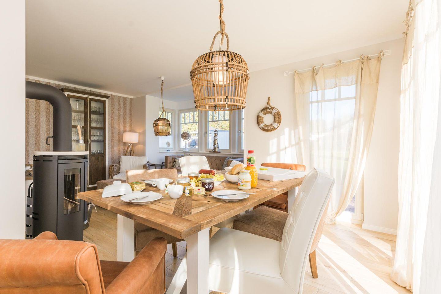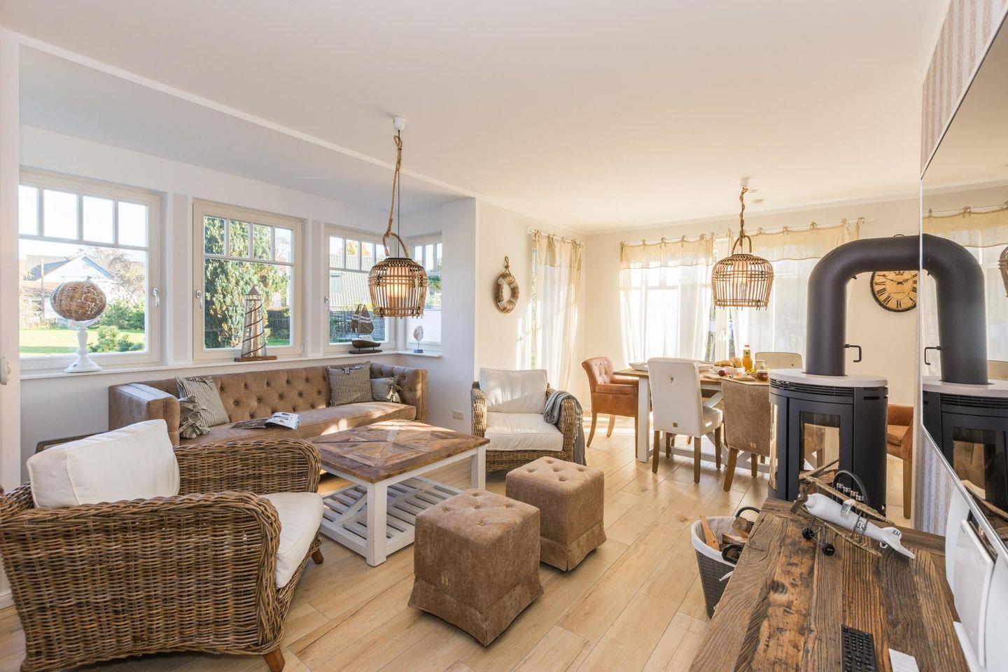 Ein großzügiger Wohnraum mit Wohn-/Essbereich ist hochwertig eingerichtet, TV, Hifi-Anlage, Kaminofen sowie mit einer kompletten offenen Küche ausgestattet.