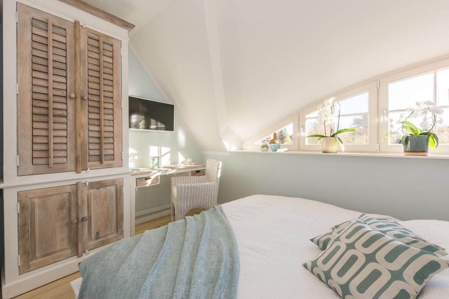 4 Schlafzimmer- 2 mit TV, davon 2 Schlafzimmer mit Doppelbetten 160x200 cm, 1 Schlafzimmer mit 140x200cm sowie Dachgeschoss mit 120x200cm.